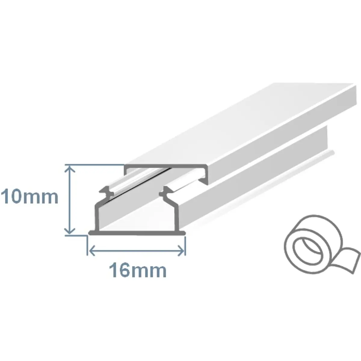 Calha de 16x10mm, branca e adesiva, vendida por metro e fornecida em comprimentos de 2 metros. O preço indicado aplica-se ao metro de calha, permitindo aos clientes estimar custos conforme o comprimento necessário.