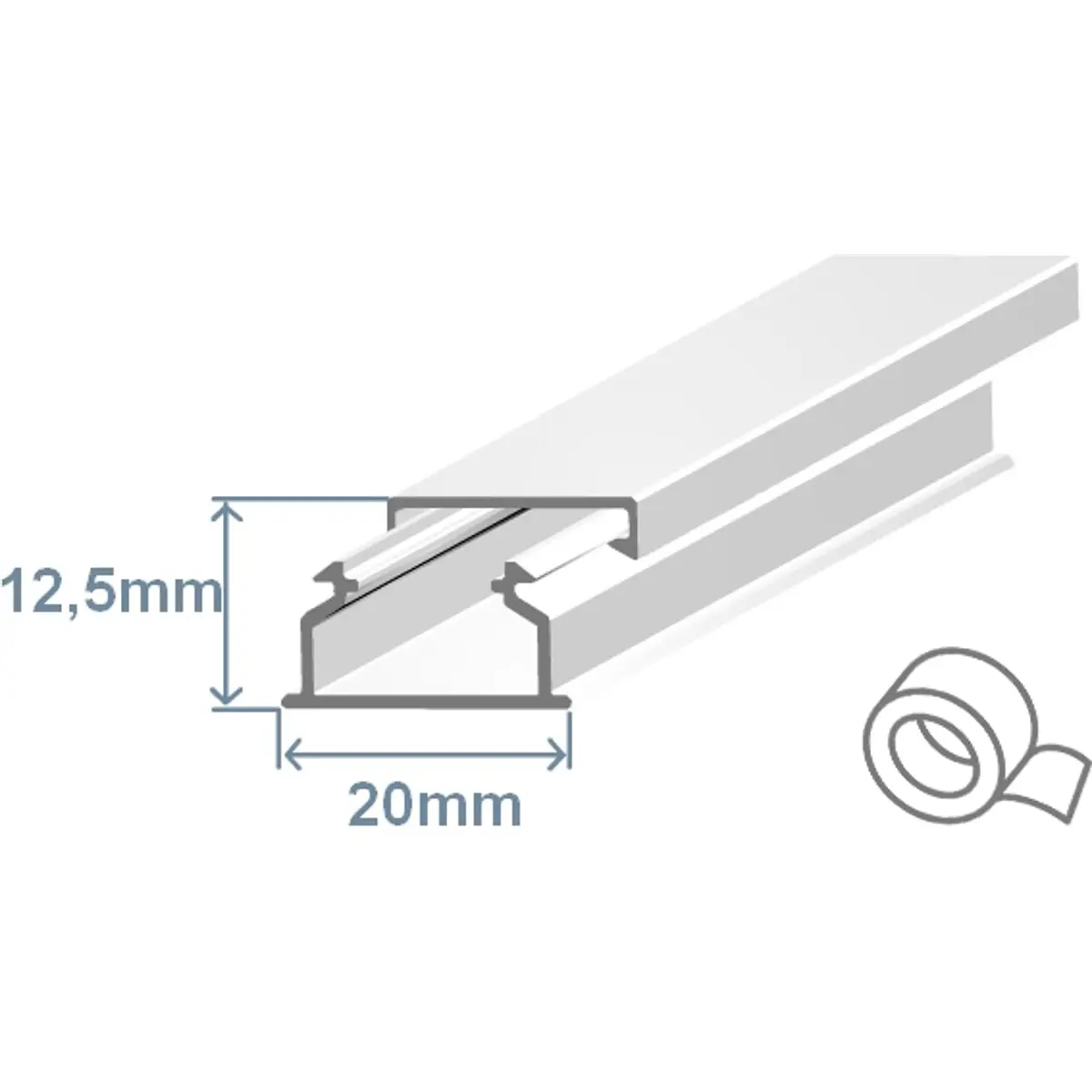 Calha adesiva branca de 20x12.5mm para organização de cabos em interiores. Fixação rápida com adesivo, sem necessidade de ferramentas, mantendo os cabos protegidos e o espaço mais limpo. Disponível em comprimentos de 2 metros, com preço indicado por metro. Ideal para residências e escritórios, melhora a estética, evita tropeços e danos nos cabos elétricos. Compatível com superfícies lisas e removível sem deixar resíduos.