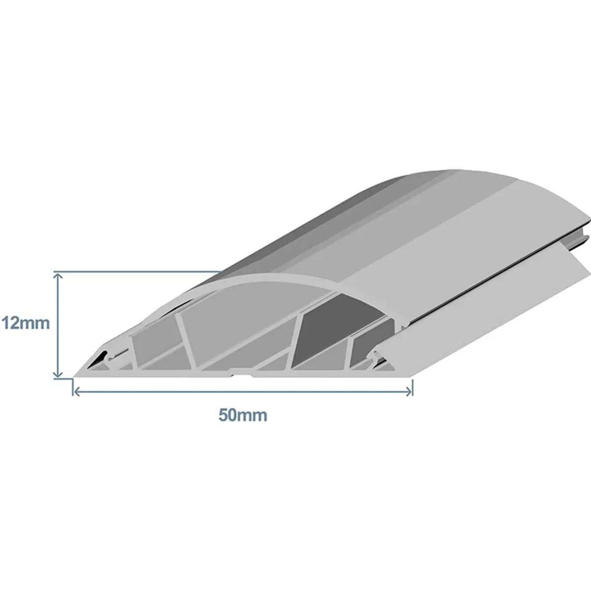 Calha de chão cinzenta, com secção de 50x12 mm, indicada para ambientes interiores. O preço indicado é por metro e o produto é fornecido em calhas de 2 metros, facilitando o planeamento de soluções. Oferece uma solução simples para manter superfícies organizadas e com acabamento discreto no pavimento.
