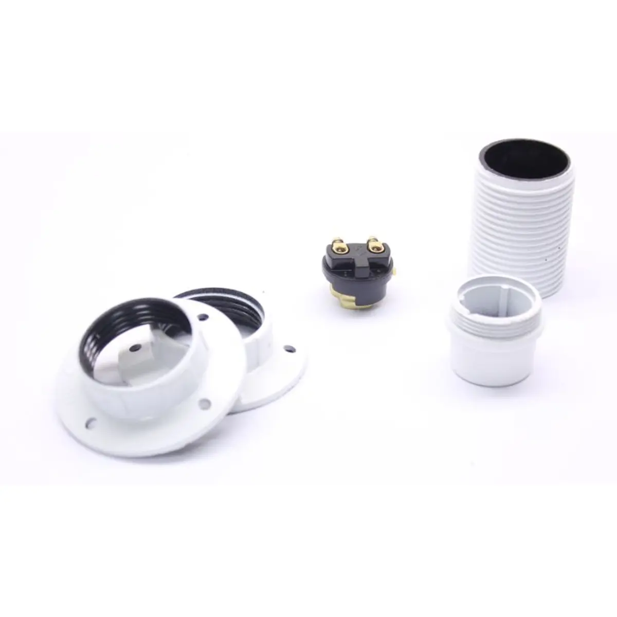Conjunto de suporte para lâmpada E14, composto por camisas E14 roscadas, miolo E14 e duas anilhas E14 brancas. Oferece um soquete completo para montagem, com roscas compatíveis e fixação estável para lâmpadas E14. Ideal para substituir componentes de iluminação ou criar montagens personalizadas. As cores podem variar ligeiramente entre peças devido ao fabrico.