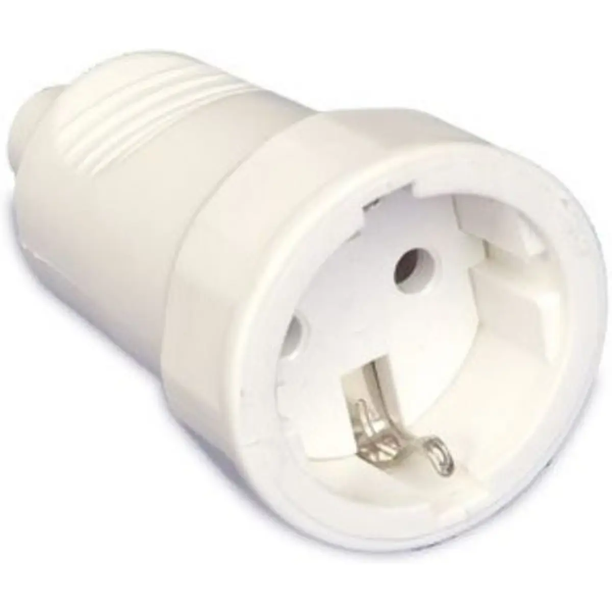 Ficha Schuko fêmea, em borracha branca, para uso com pinos de Ø4.8mm. Suporta até 250V e 16A, oferecendo protecção para crianças. Ideal para ligações elétricas seguras em residências, com isolamento confiável e resistência a desgaste. Compatível com tomadas Schuko padrão, adequada para aplicações domésticas e projetos de instalação elétrica que exigem componentes simples, seguros e duráveis.