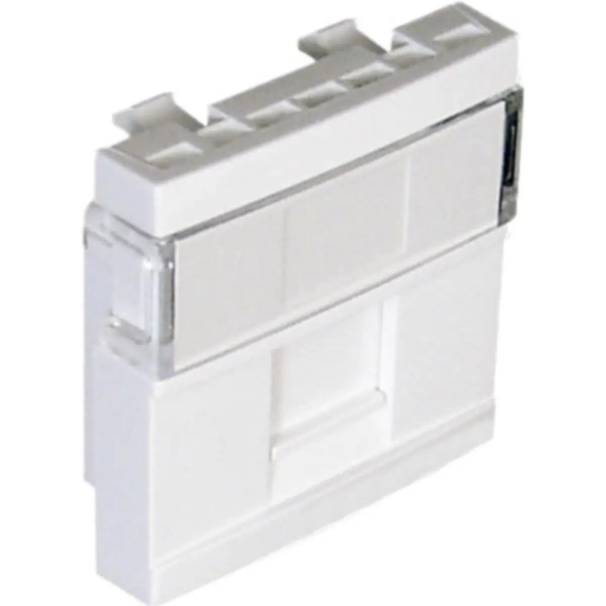 Este módulo oferece uma única saída para conectores RJ45, concebido para montagem em quadros elétricos e infraestruturas de rede. Compatível com conectores RJ do tipo Keystone, não vem equipado com conectores, permitindo a integração apenas com os componentes Keystone adequados.