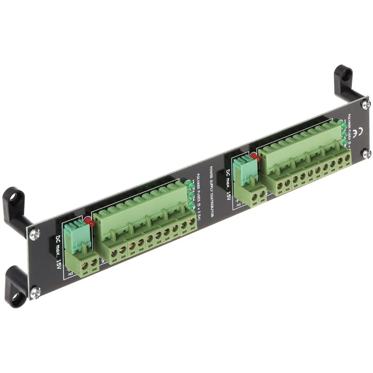 Distribuidor de alimentação 15VDC com duas réguas de 5 saídas cada, fornecendo até 12,5A por régua e 2,5A por saída. Possui duas entradas, fusível de polímero, conectores de parafuso e caixa em placa PCB. O equipamento funciona entre -50ºC e 55ºC, suporta humidade relativa até 95% e tem dimensões de 216x40x20mm, pesando 80g. Ideal para distribuir alimentação estável em sistemas com várias saídas, como gabinetes ou montagens em bancada.