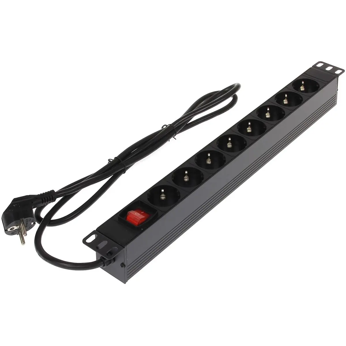A unidade de distribuição de energia (PDU) com 8 tomadas 230V oferece alimentação estável a 230 VAC, 50 Hz, suportando até 16 A e uma carga máxima de 3500 W. Ideal para racks de 19 polegadas em 1U, com cabo de 1,8 m, dimensões compactas (484 x 45 x 57 mm) e peso de 740 g. Inclui interruptor com luz integrada para monitorização rápida e facilita a gestão de fontes elétricas num armário de rede.