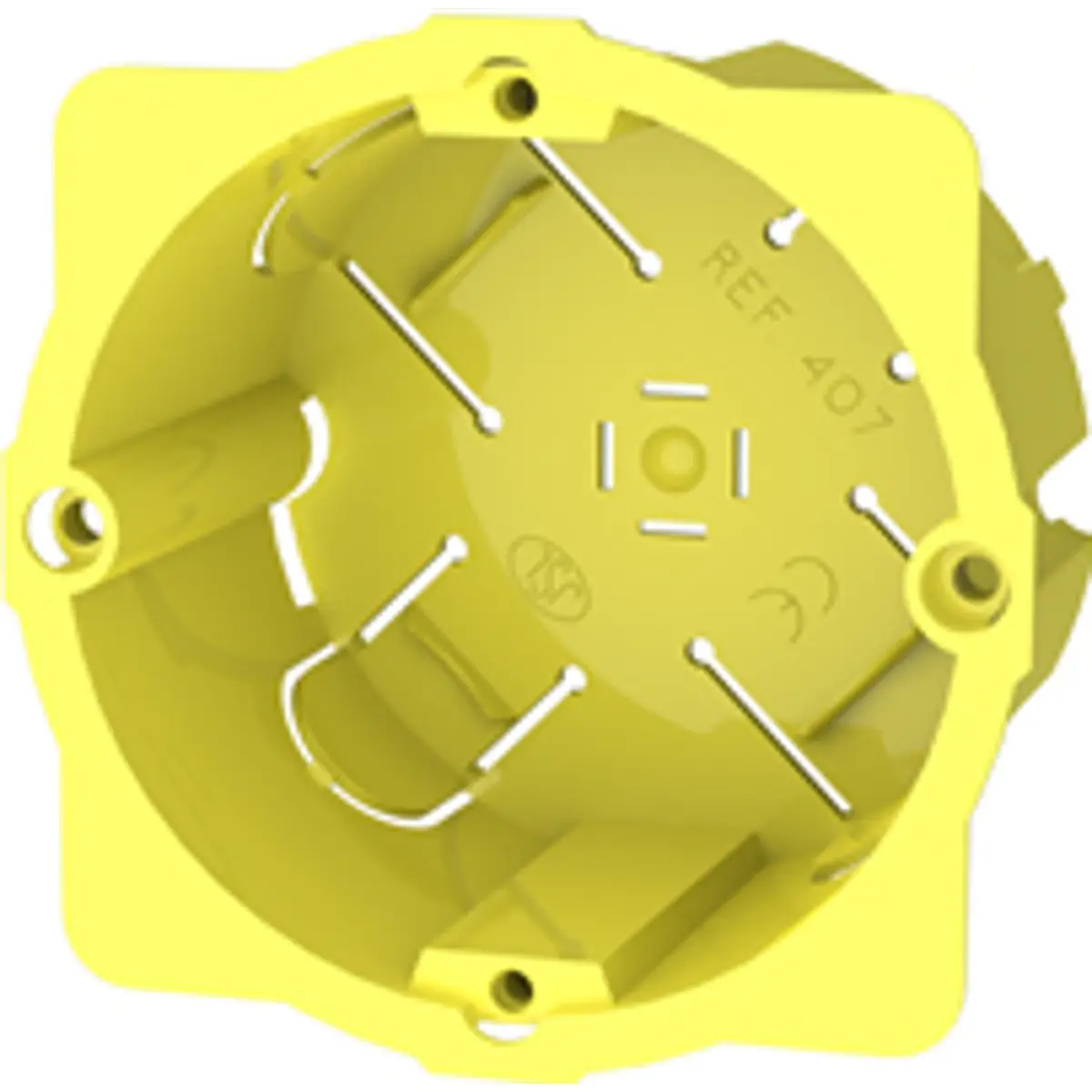 Caixa de aparelhagem agrupável para embutir em gesso cartonado (drywall), com quatro entradas para tubo anelado Ø20/25. Destinada a instalações elétricas em paredes de drywall, facilita a organização de ligações e o acesso para inspeção. Dimensões Ø65x40 mm, oferecendo compatibilidade com estruturas de gesso.