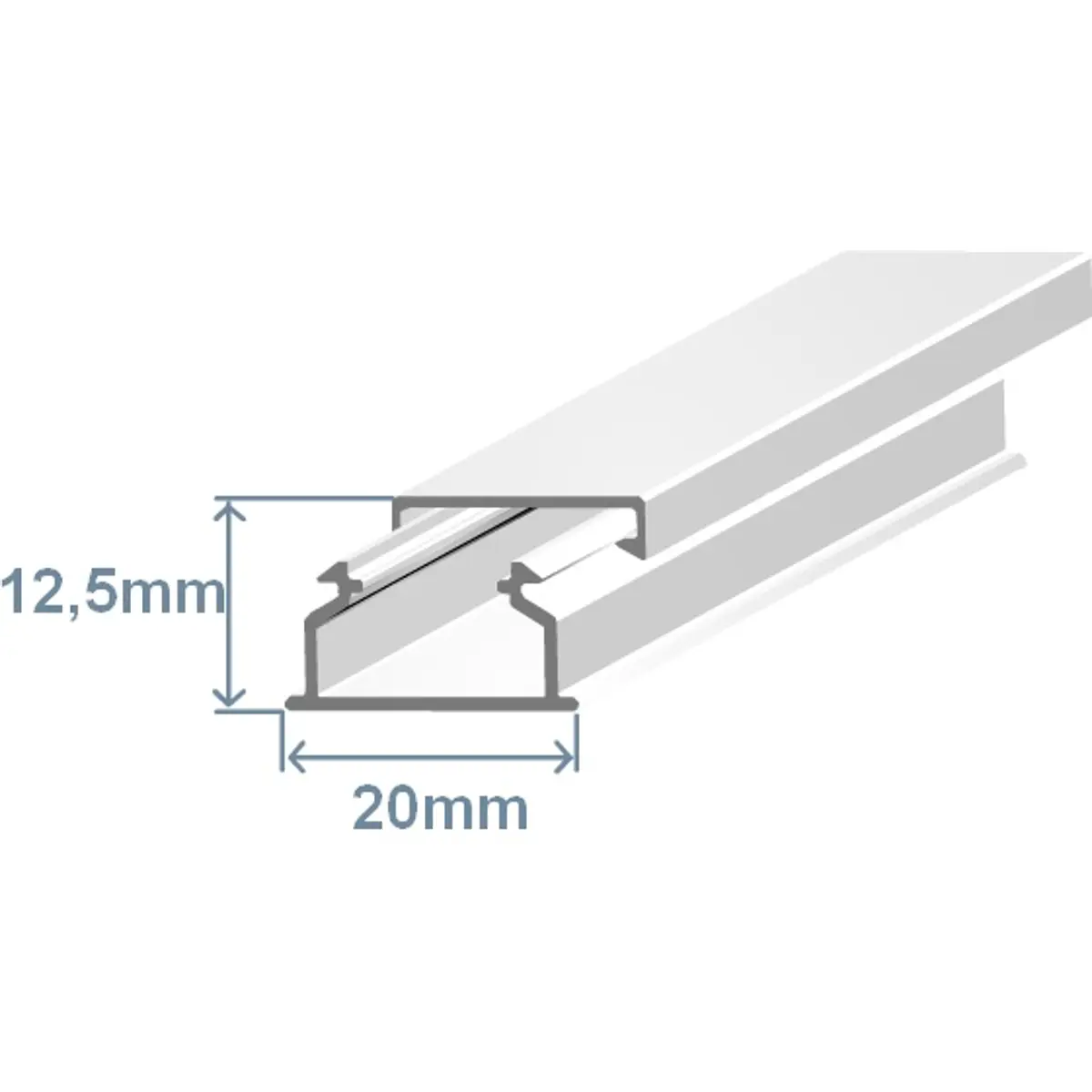 Calha branca de 20x12,5mm destinada à organização e proteção de cabos em instalações elétricas. Fornecida em comprimentos de 2 metros, com preço indicado por metro. Ideal para gerir cablagens em painéis, mobiliário e paredes, assegurando um acabamento limpo, seguro e de fácil manutenção.