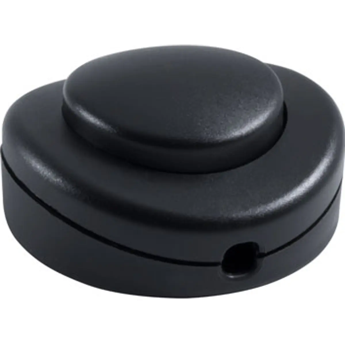 Interruptor de pé redondo, na cor preta, com diâmetro de 6,5 cm e altura de 2,3 cm, fabricado em resina termoplástica. Esta peça oferece simplicidade de montagem e durabilidade, facilitando a integração em vários dispositivos elétricos. Ideal para aplicações que exigem uma solução estável de acionamento mecânico.
