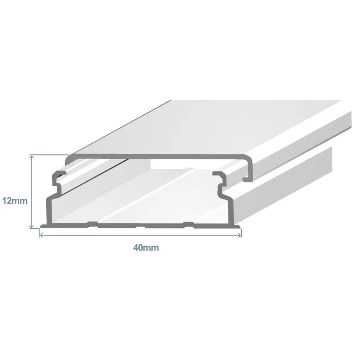 Calha de 40x12.5mm, branca, sem divisória. O preço indicado é por metro e as calhas são fornecidas em peças de 2 metros.
