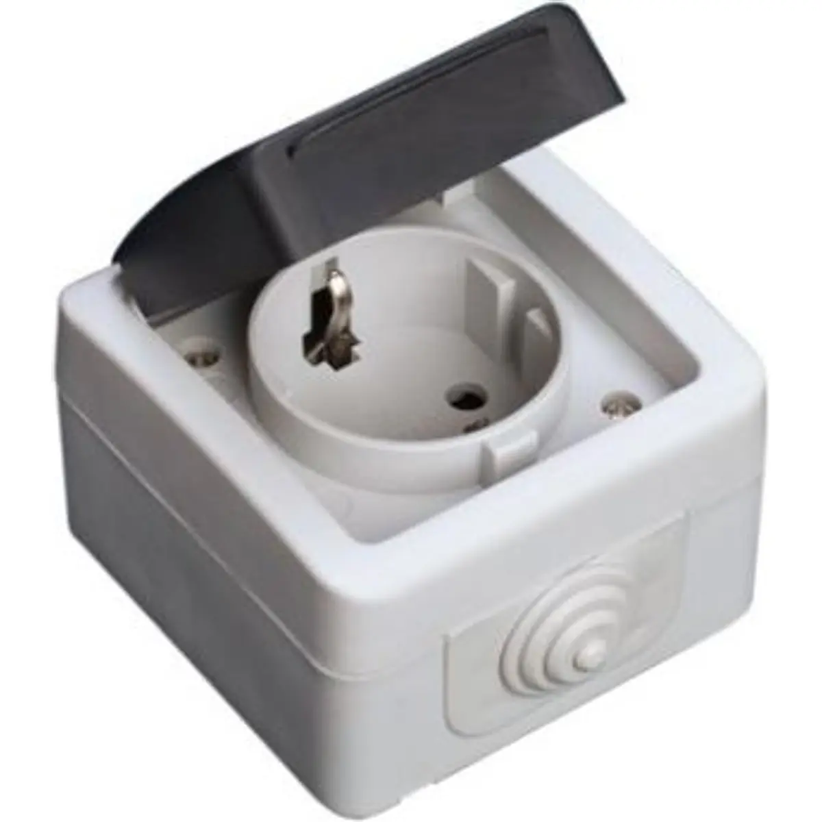 Tomada Schuko estanque para uso exterior com classificação IP44, capaz de 16 A a 250 V. Proporciona proteção de crianças e dimensões de 70x70x50 mm, facilitando a instalação em exteriores como jardins, varandas e áreas de serviço. Recomendada para ambientes húmidos, com montagem segura e resistência a condições climáticas adversas, assegurando alimentação eléctrica estável.
