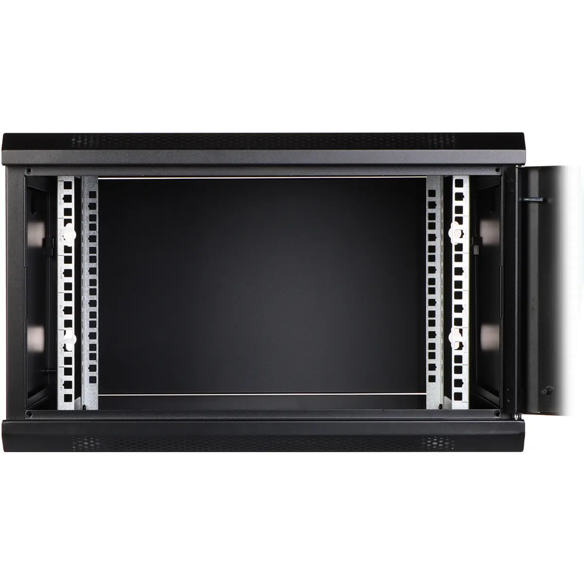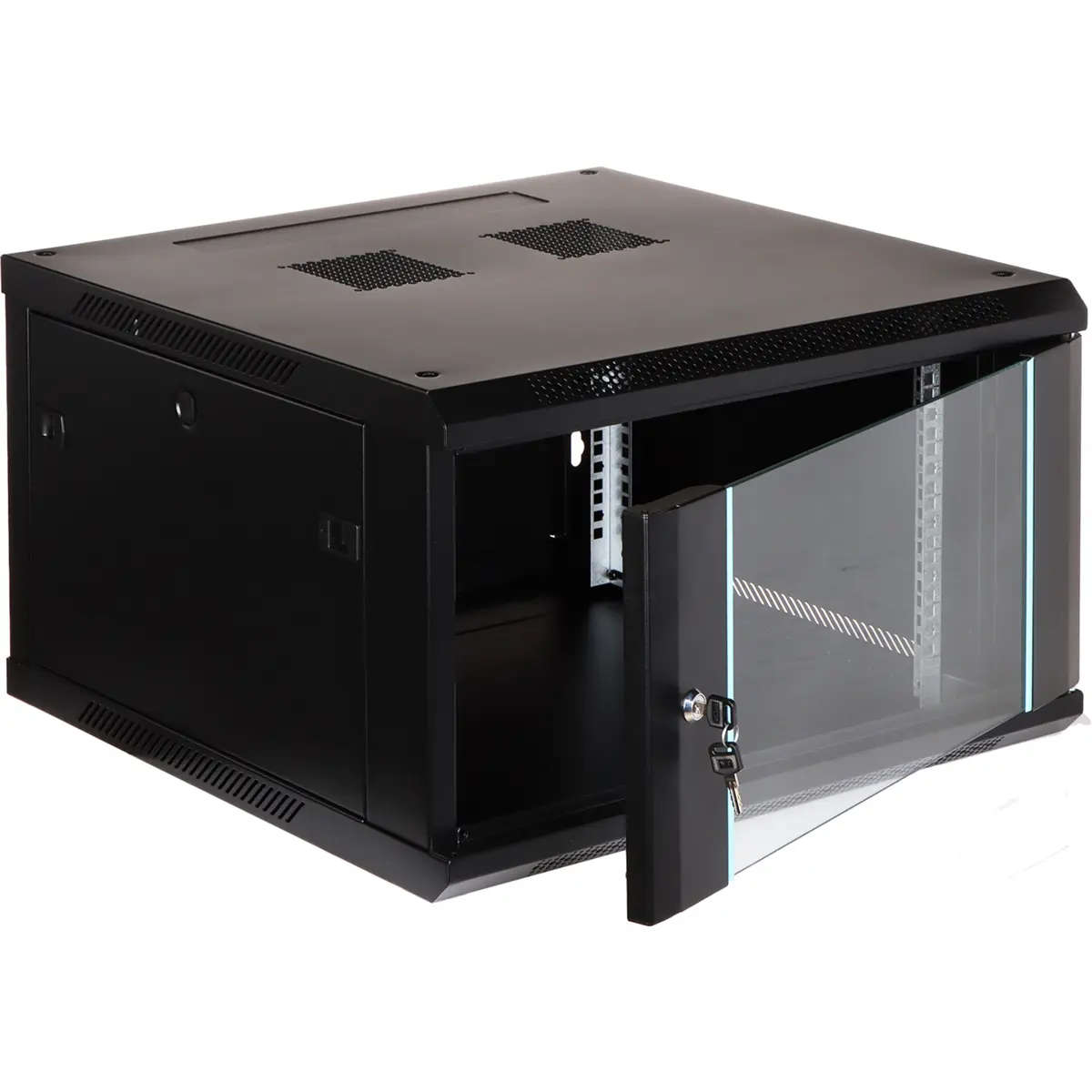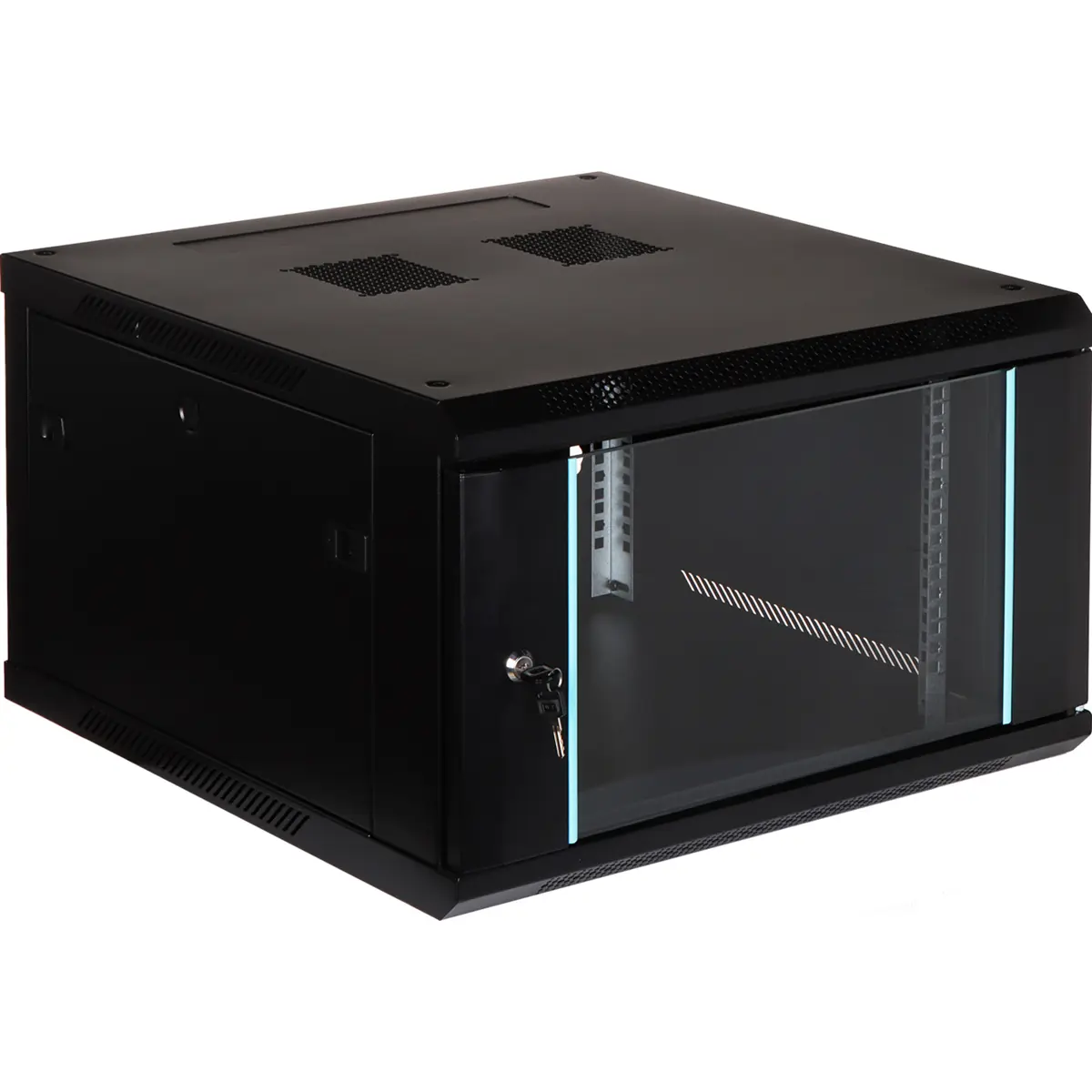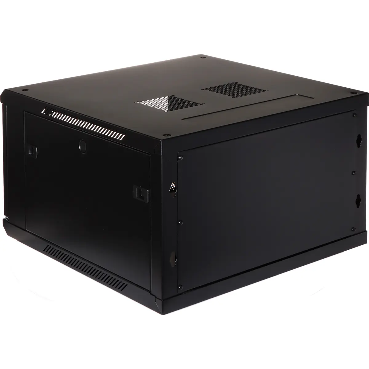 Armário bastidor de parede 19'' (6U) para equipamento de rede com porta frontal de vidro e porta lateral com fechadura snap-in. Inclui furo para cabos na parede posterior, aberturas para ventiladores 105x105mm e paredes laterais removíveis. Peso 19,2 kg e capacidade de carga 60 kg, cor preta. Dimensões internas: 19'' de largura, 545 mm de profundidade e 6U de altura; dimensões externas: 600x600x370 mm. Vendido desmontado e com 2 chaves.