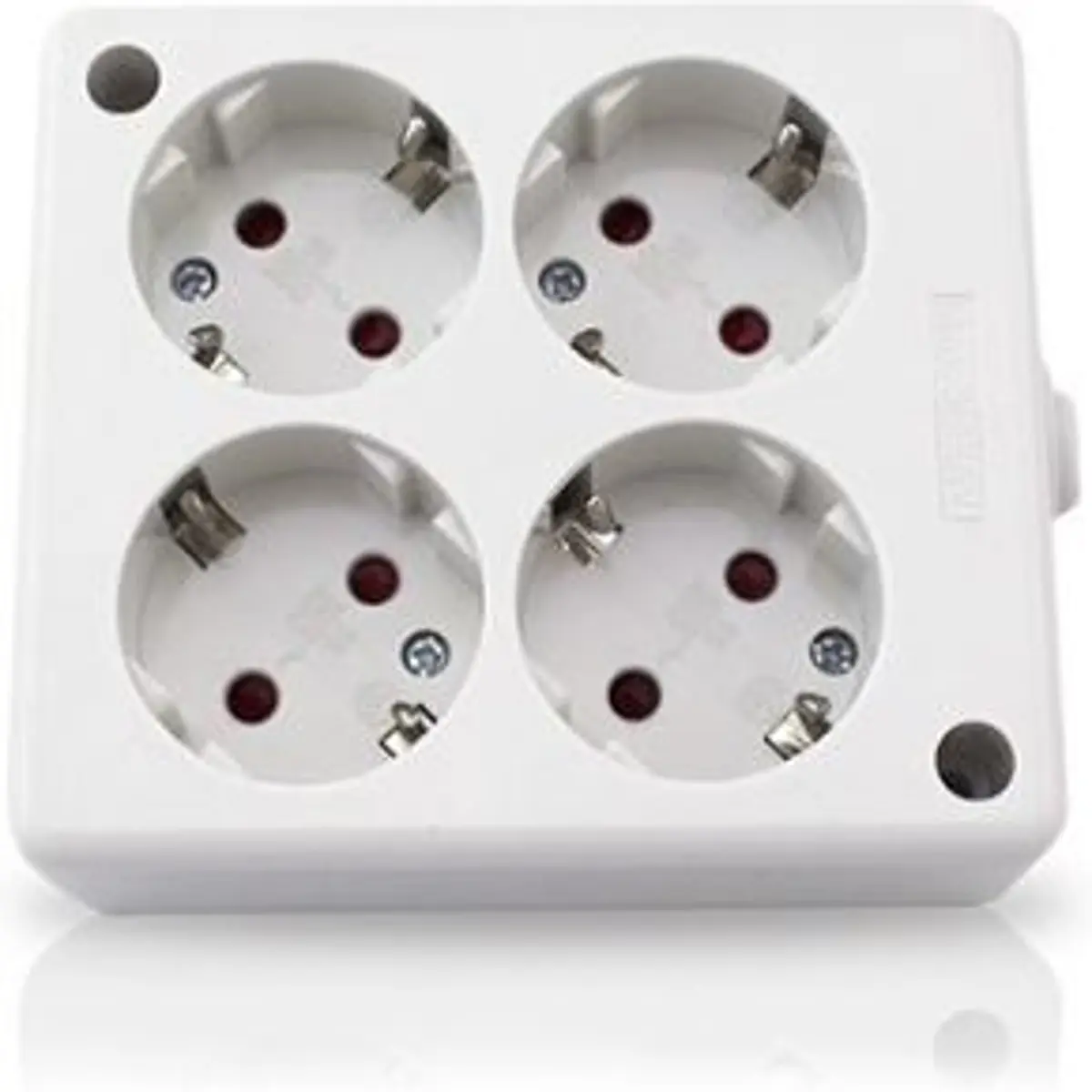 Bloco de tomadas com 4 fichas Schuko para uso interior, sem cabo elétrico e sem interruptor. Possui ficha 10/16A-250V e potência máxima de 3500W, ideal para ligar vários dispositivos sem cablagem visível. Adequado a ambientes residenciais ou comerciais que pretendam evitar cablagem externa, com acabamento branco discreto.
