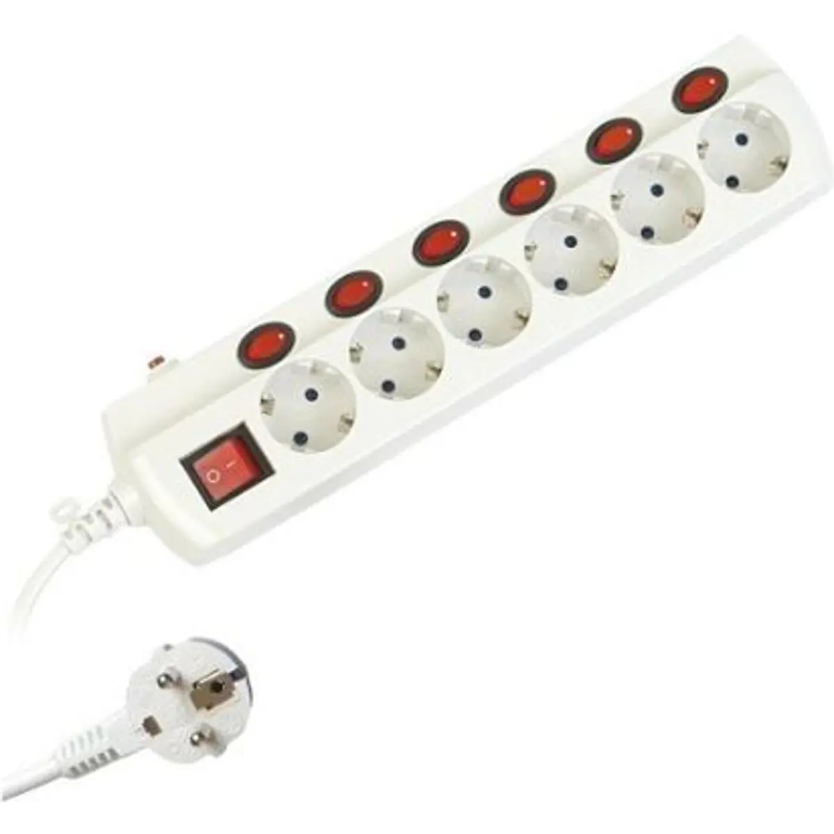 Este bloco de tomadas oferece 6 tomadas Schuko com interruptor geral e interruptores individuais, proporcionando gestão segura de energia. Inclui proteção contra picos de tensão e sobreaquecimento, disjuntor integrado e cabo de alimentação H05VV-F 3x1,5 mm² com 1,5 m de comprimento. Adequado para uso interior, com cor branca, organização de cabos e potência máxima de 3500 W.