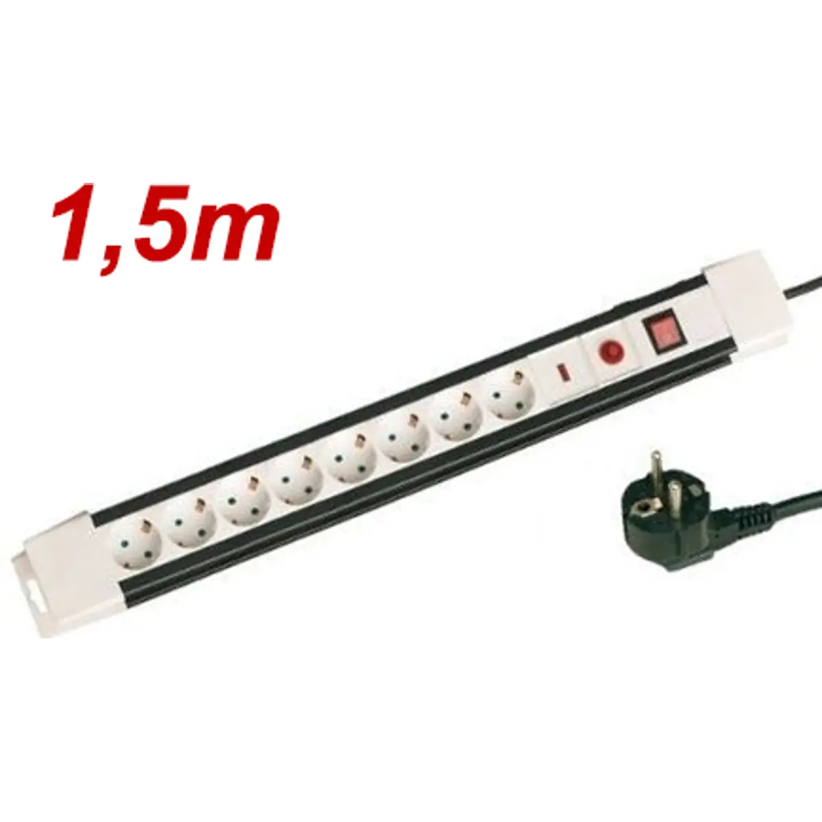 Bloco de tomadas com 8 tomadas tipo Schuko, interruptor integrado e proteção contra sobrecarga e sobreaquecimento, ideal para uso em interiores. O cabo de alimentação é H05VV-F com condutores de 3x1.5mm² e comprimento de 1,5 metros, oferecendo uma potência máxima de 3500W. Permite ligar múltiplos dispositivos com segurança, assegurando distribuição de energia eficiente e proteção contra sobrecargas para residências, escritórios e espaços comerciais.