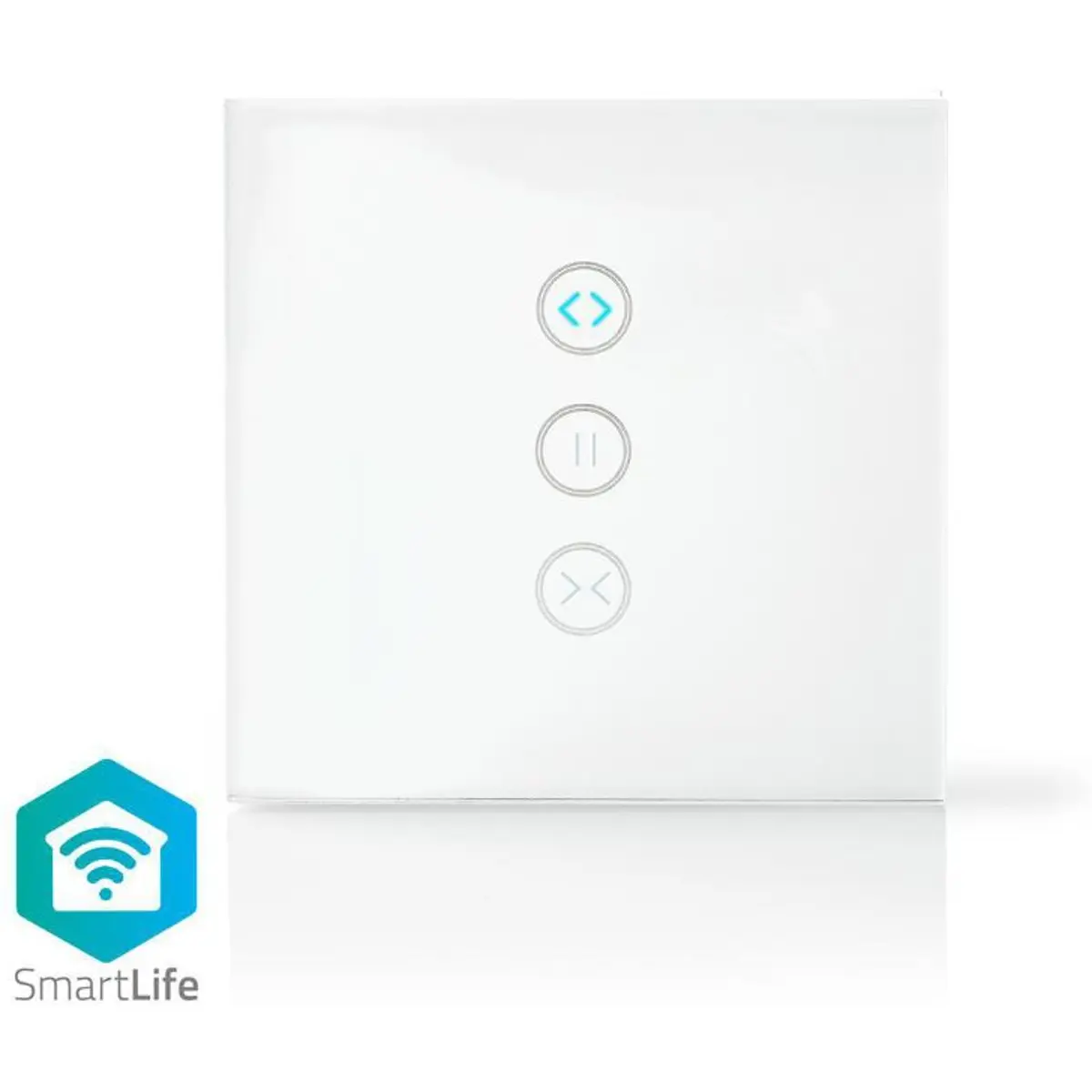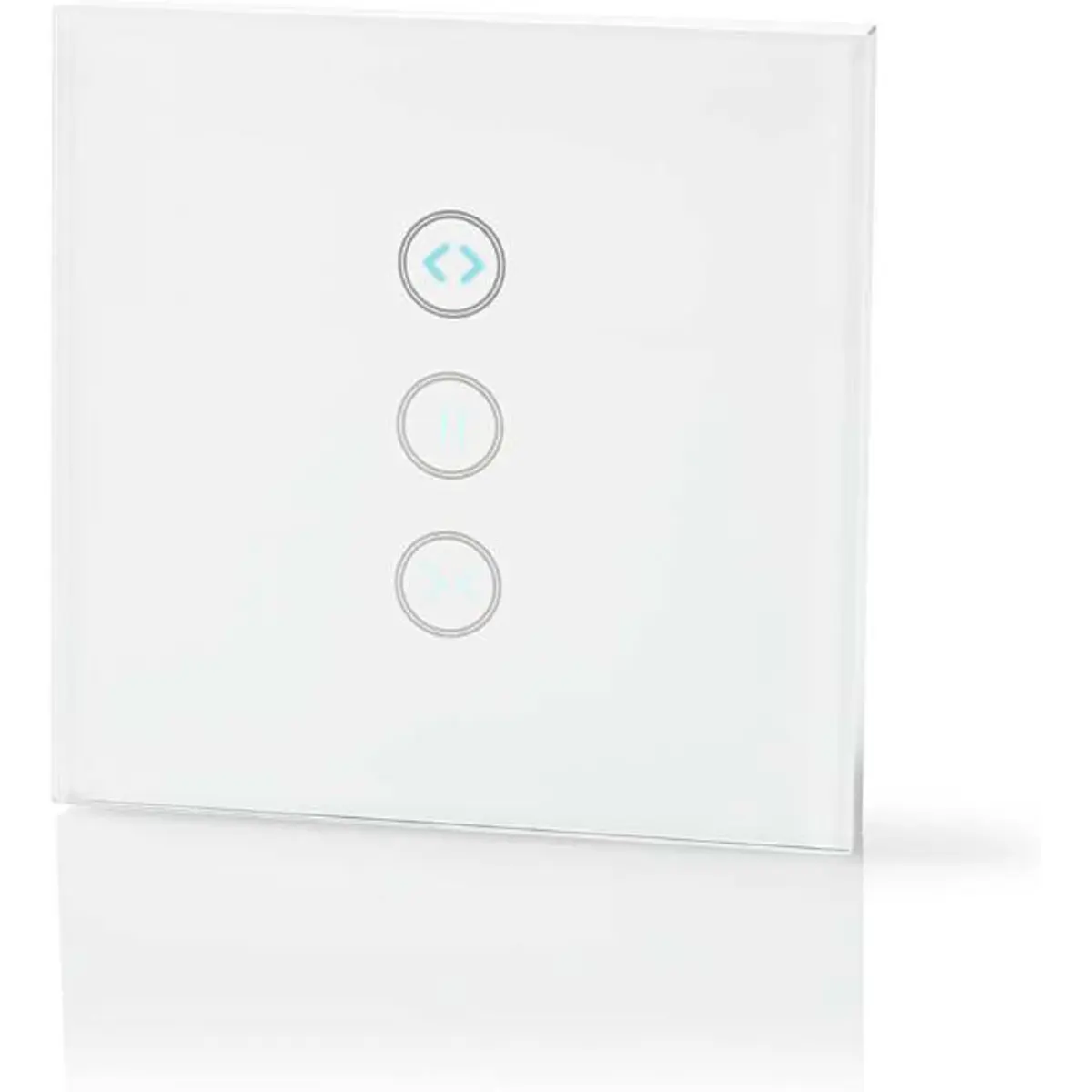 Controlador touch para cortinas, estores e persianas elétricas com Wi-Fi, compatível com Nedis SmartLife e Smart Life (TUYA). Permite abrir e fechar via smartphone ou comandos de voz (Alexa, Google Home), sem hubs, com instalação prática. Suporta até 300 W, dimensões 86x86 mm e acabamento branco em vidro, oferecendo programação de horários e automação com outros dispositivos SmartLife. Opera em 0-80 °C, com faixa de frequência 2412-2462 MHz e antena de 2 dBi.