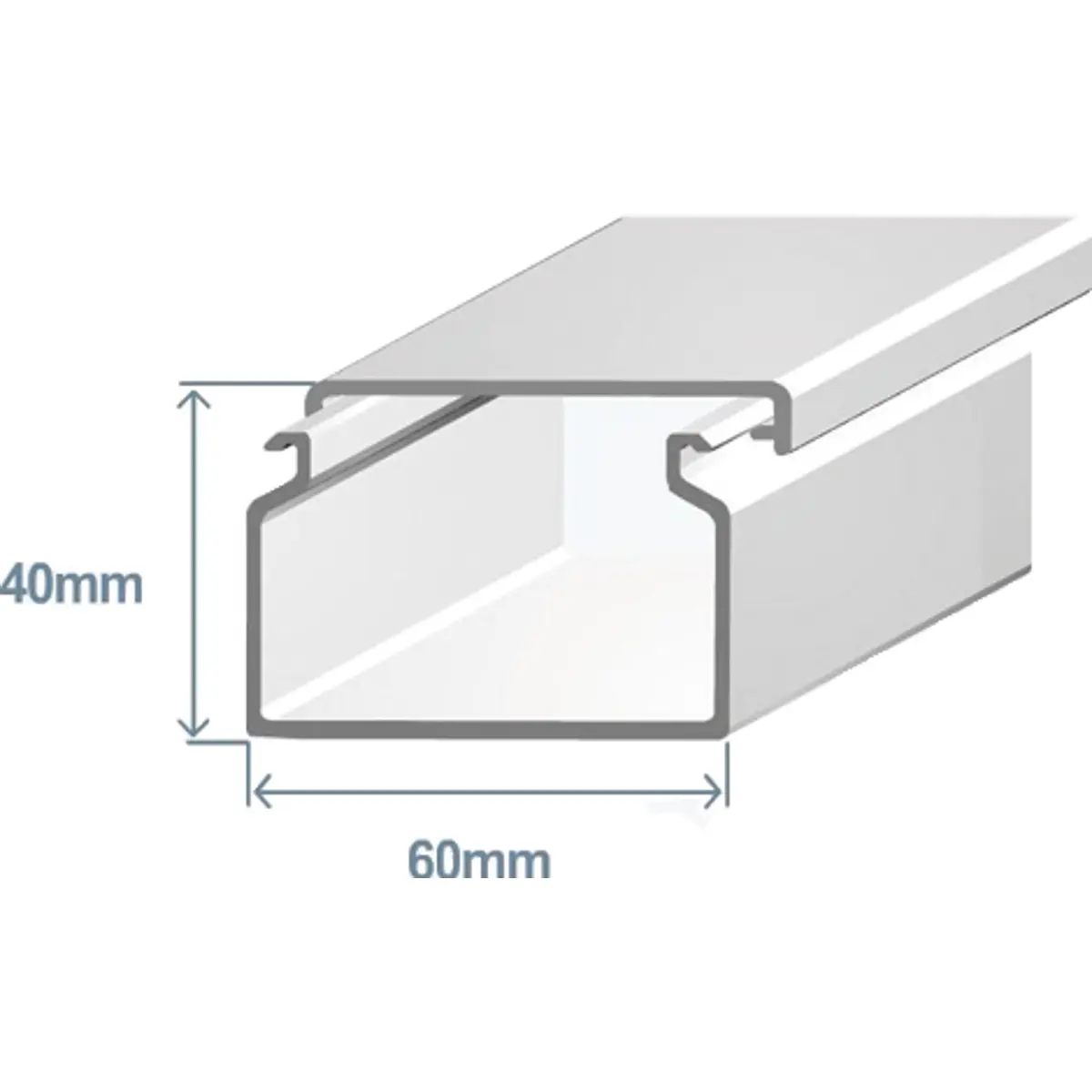 Calha de 60x40 mm, branca, vendida por metro e fornecida em comprimentos de 2 metros. Ideal para instalações modulares onde é necessário ajustar o comprimento, permitindo planeamento simples. O preço indicado é por metro, facilitando o dimensionamento do orçamento e a seleção de peças para o espaço disponível, sem depender de marcas específicas.
