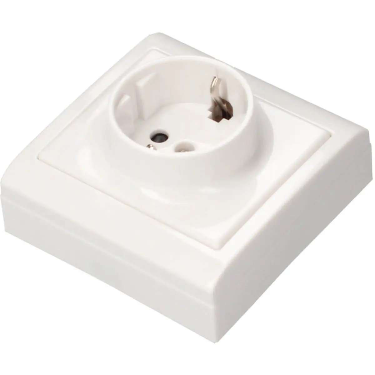 Tomada schuko de superfície 2P+T com proteção infantil para uso em interiores. Compatível com 230VAC e potência até 16A, fabricada em policarbonato resistente. Possui dimensão de 80x80x41mm, oferecendo instalação discreta em paredes ou mobiliário. Ideal para ambientes domésticos e profissionais que exigem componentes elétricos fiáveis, duráveis e seguros, com foco na qualidade de construção e na segurança dos utilizadores.