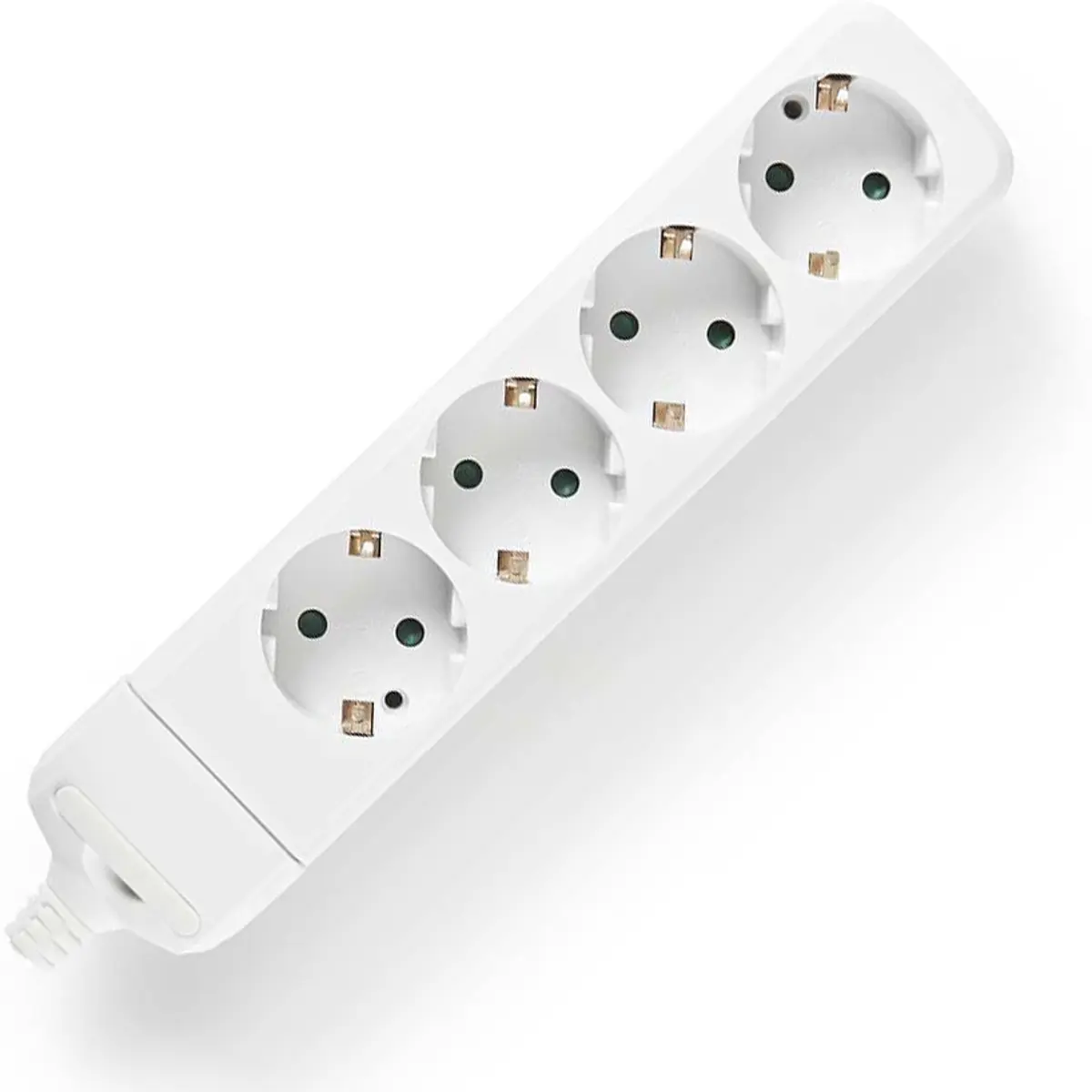Bloco de tomadas para uso interior com quatro fichas Schuko, sem cabo incluído, cor branca. Suporta 230V e até 3680W, com comprimento de 250mm. Ideal para fornecer alimentação segura em casa ou no escritório, com proteção para crianças mediante alvéolos, sem interruptor e sem necessidade de cabo externo.