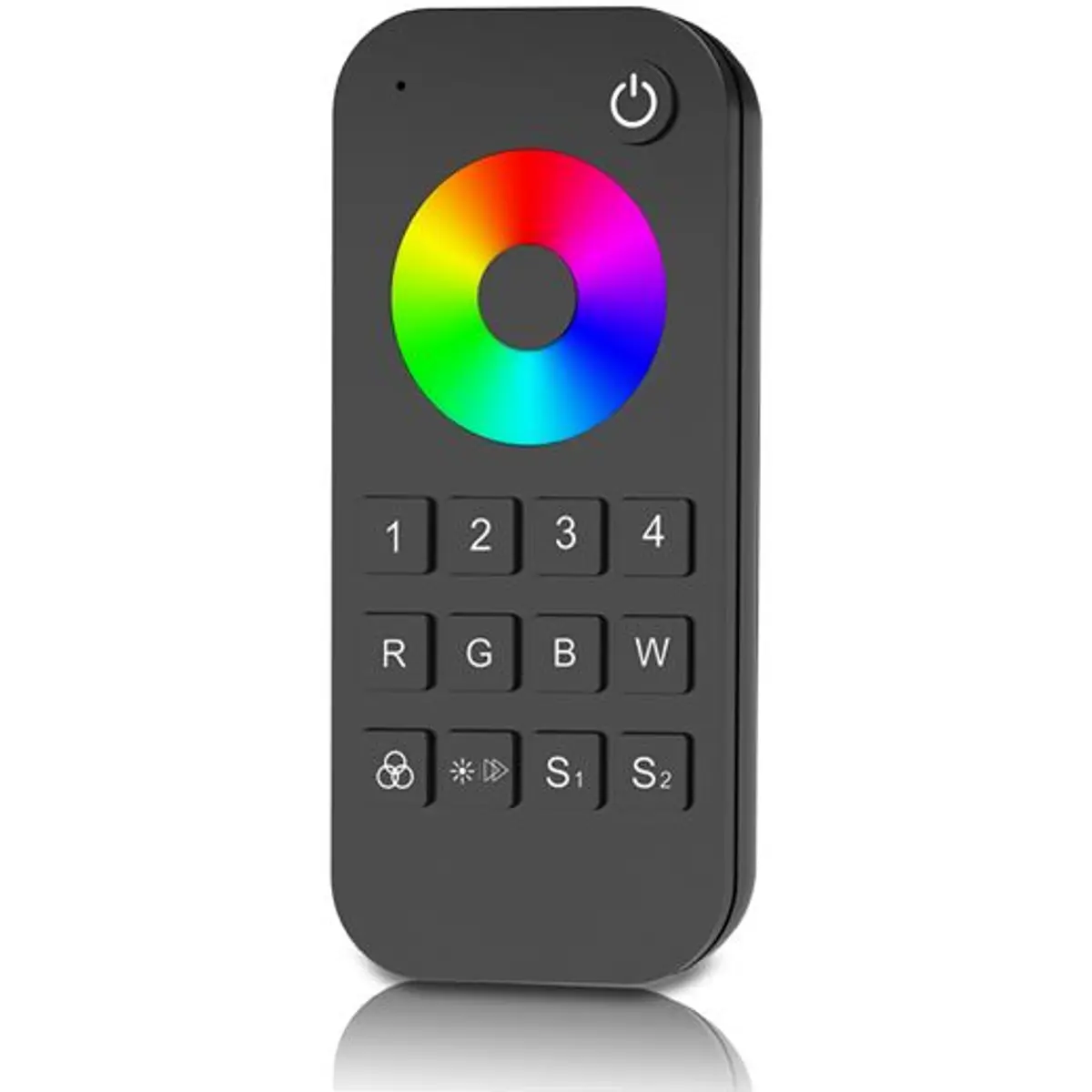 Comando RF para controlador LED RGB+W de 4 zonas permite gerir LEDs RGB ou RGBW de forma dimável, com roda de toque ultra sensível para ajuste de cor. Funciona em 2,4 GHz com alcance de até 30 metros e pode registar um ou mais receptores. Alimentado por duas pilhas AAA, apresenta LED indicador de funcionamento e memória interna que guarda a última função. Oferece 12 programas pré-definidos e controlo de cores On/Off, dimmer, flash, strobe, fade e smooth, com suporte a distâncias curtas e temperaturas de operação entre -30 °C e 55 °C.