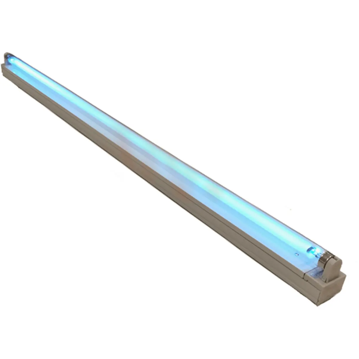 Desinfeção de ar e água com armadura que alberga uma lâmpada UV-C germicida de 36W. Vida útil nominal de 9000 horas, operação a 103V e 0,44A, com conteúdo de mercúrio de 2 mg. Compatível com TL-D 36W (T8, 120 cm). Recomenda-se precauções de segurança: não expor pessoas ou animais à radiação UV, usar luvas ao manusear e encaminhar a lâmpada defeituosa para reciclagem adequada.