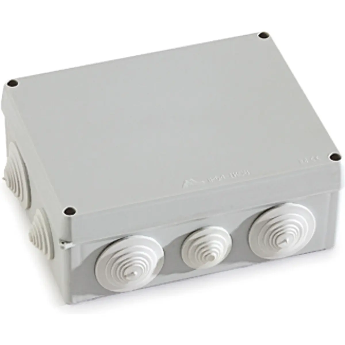 Caixa de derivação estanque para exteriores, composta por caixa e tampa em PP cinza com vedante EPDM, destinada a instalações elétricas externas. Possui IP54 e IK08, fecho com parafusos de 1/4 de volta para selagem da tampa, e tampões em PVC. Oferece isolamento de 600V, Classe II e uma faixa de temperatura entre -5º a +60ºC. A montagem pode ser realizada superficialmente ou em muros sólidos não combustíveis, conforme EN 60670-1, assegurando proteção duradoura contra intempéries.