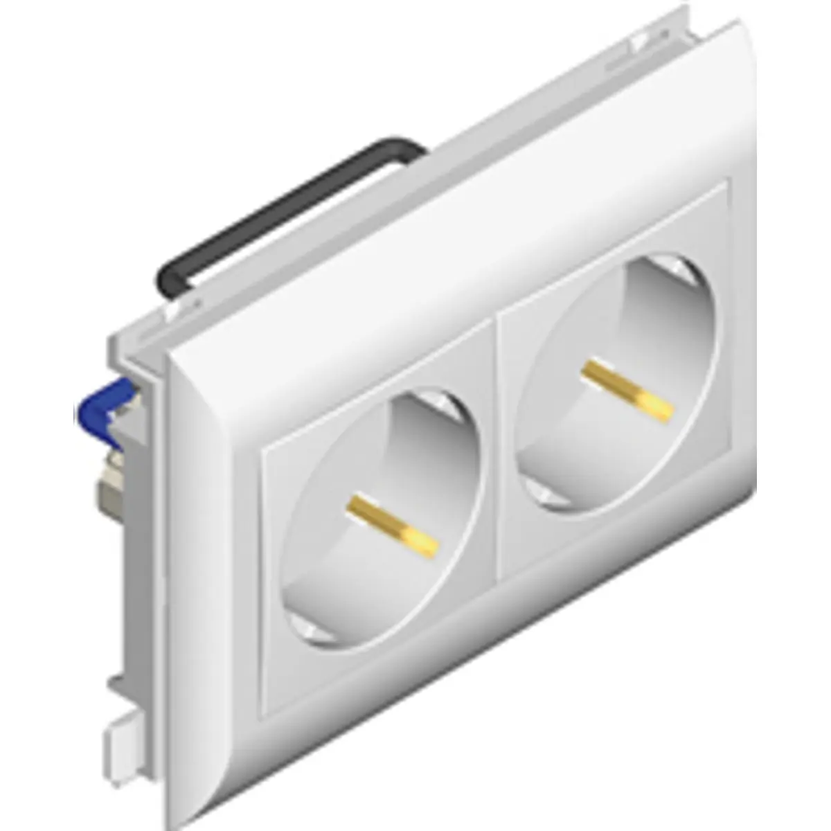 Tomada dupla Schuko com alvéolos protegidos (obturador), para instalação em calhas técnicas de distribuição (série 10 e 16) que possuam tampa de largura de 75mm.