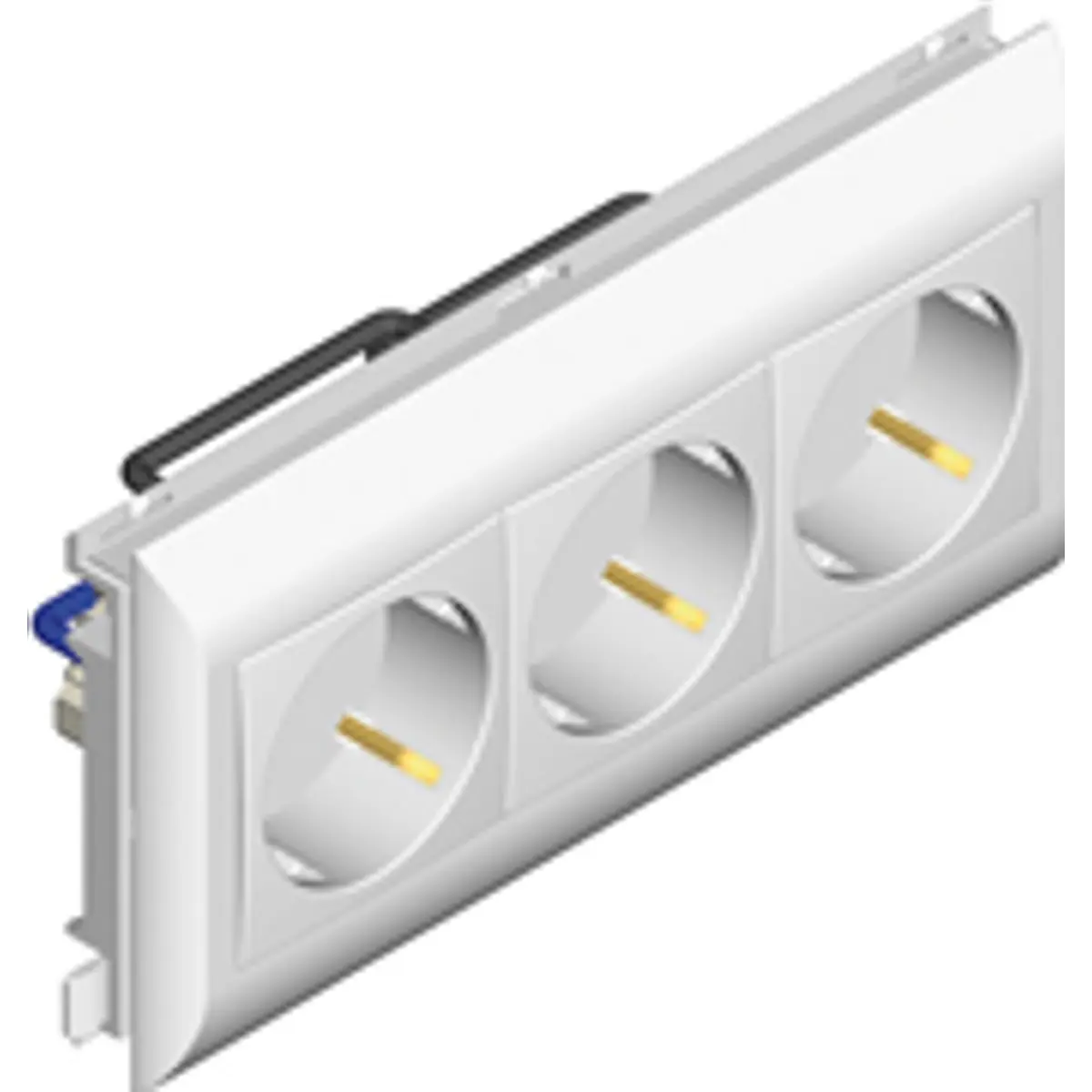 Tomada dupla Schuko com alvéolos protegidos (obturador), para instalação em calhas técnicas de distribuição (série 10 e 16) que possuam tampa de largura de 75mm.