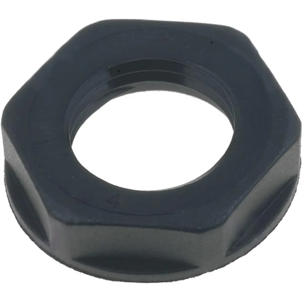 Porca preta com rosca PG7 em poliamida, com temperatura de funcionamento entre -20 a 100 °C e classificação de inflamabilidade UL94V-2. Adequada para fixações seguras em ambientes industriais, oferece boa resistência mecânica, leveza e compatibilidade com componentes PG7. Ideal para ligações elétricas e aplicações que exijam resistência térmica e segurança contra fogo.