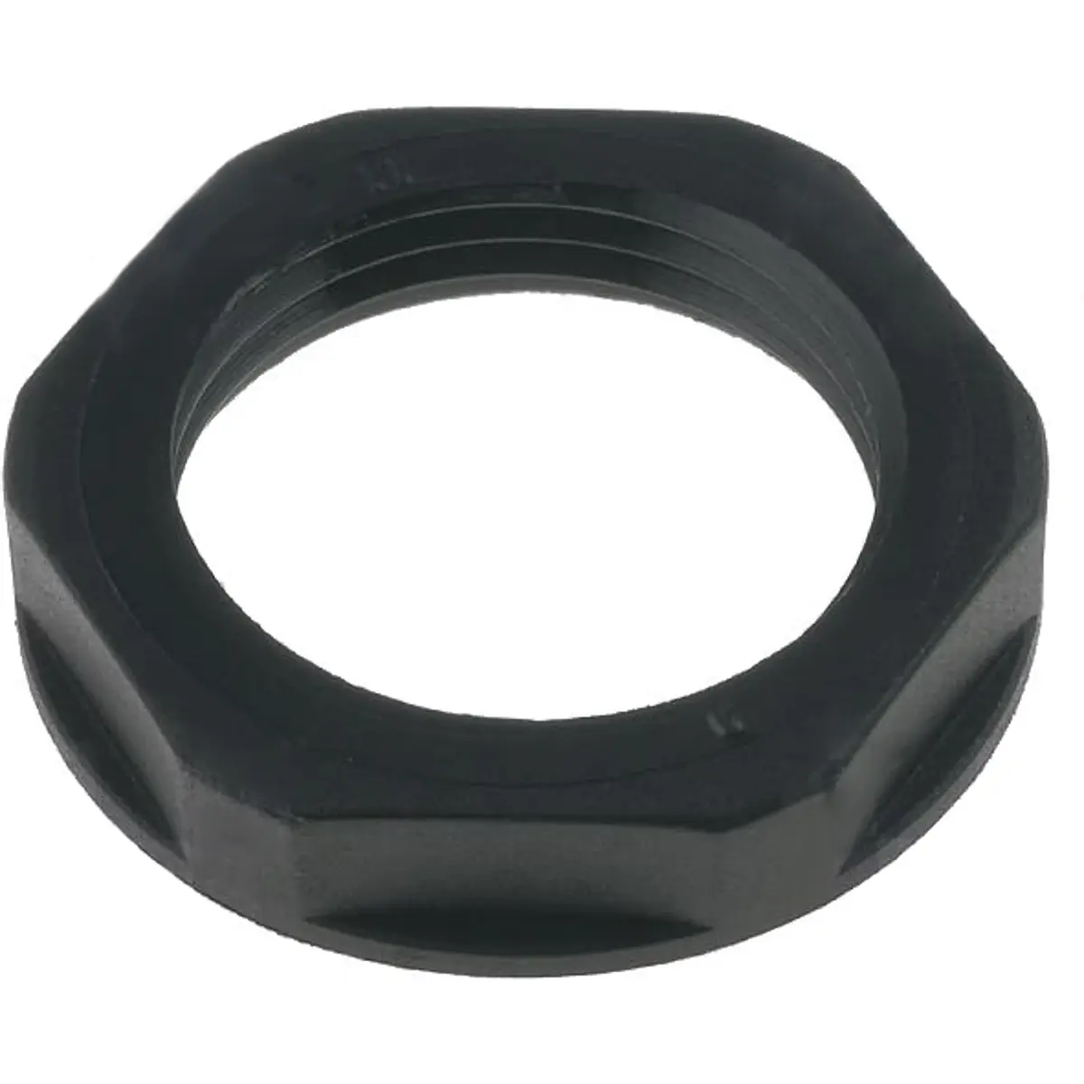 Porca preta para bucins PG11, fabricada em poliamida, com rosca PG11 de 18,6mm e cor preta. Opera entre -20 e 100°C e tem classificação de inflamabilidade UL94V-2.