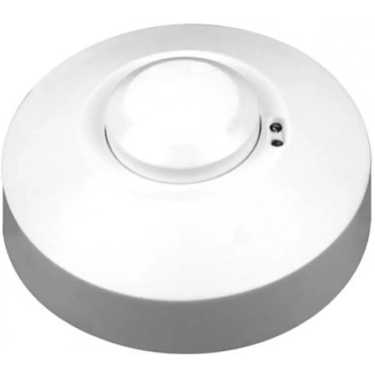 O sensor de movimento por micro-ondas para interiores suporta 230VAC, potência até 1200W e transmissão inferior a 10mW. Deteta movimento entre 1 e 8 metros num ângulo de 360º, com regulação de luminosidade entre 2 e 2000 lux. Classificação IP20, funciona de -15..70ºC, adequado para ambientes internos.