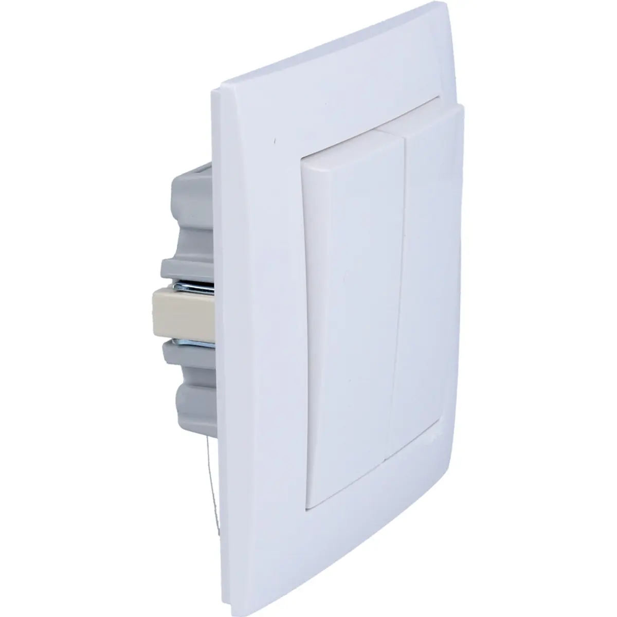 Comutador de lustre com espelho para montagem em um único local, capaz de controlar dois circuitos de iluminação. Suporta 10AX a 250VAC, oferecendo confiabilidade para instalações domésticas. Ideal para aplicações residenciais em paredes e painéis, simplificando a gestão de iluminação com apenas um interruptor. Acabamento branco, compatível com padrões de montagem, fornecendo uma solução prática e segura para controlar a luz de dois circuitos.