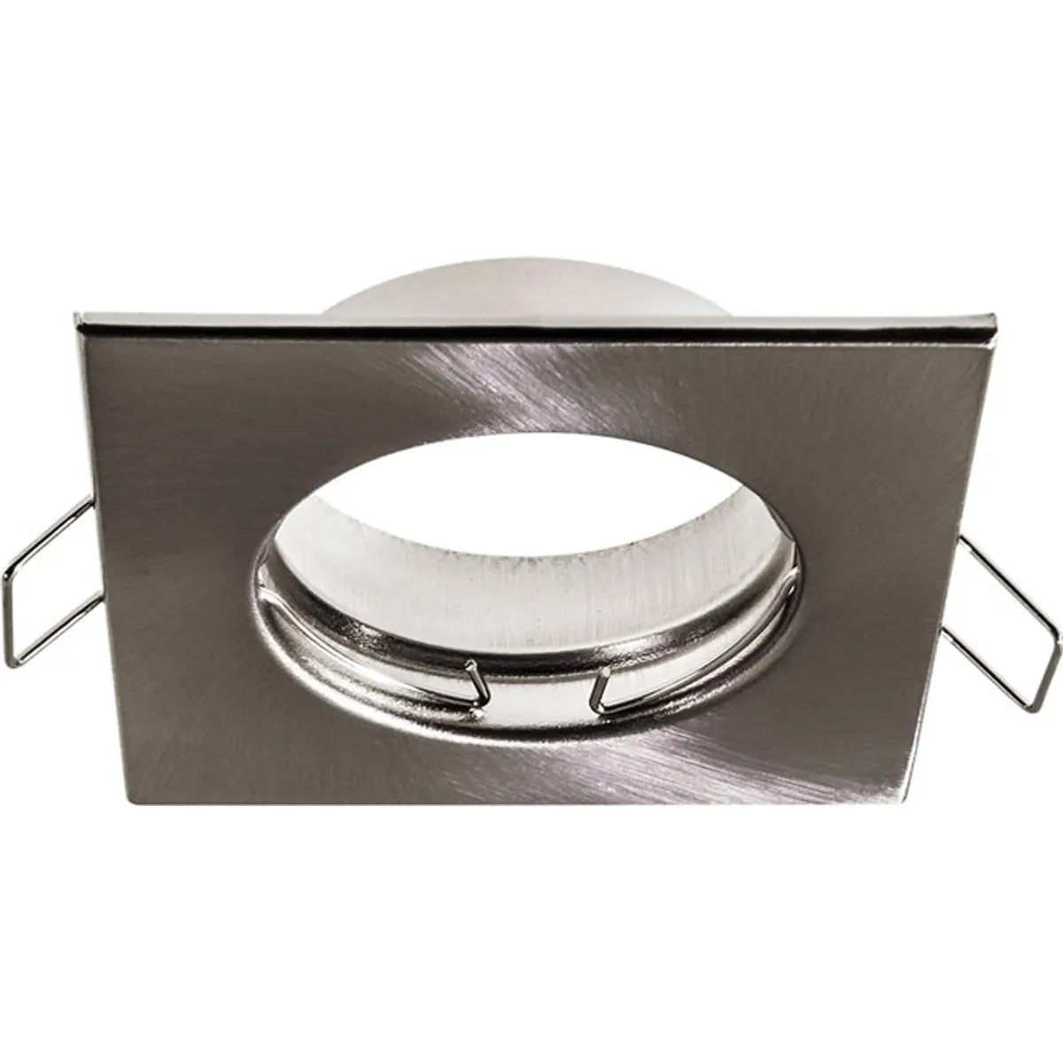 aro quadrado fixo com mola para lâmpadas GU10/MR16, em aço escovado, oferece fixação estável com diâmetro de montagem de 65 mm, medidas 80x80 mm e altura de 21 mm. Compatível com lâmpadas GU10 e MR16, facilita a instalação com mola de retenção, proporcionando acabamento moderno para iluminação de interiores. Ideal para tetos e caixas de iluminação, o design compacto e o acabamento em aço escovado associam robustez, simplicidade de montagem e estética discreta em diversos ambientes.