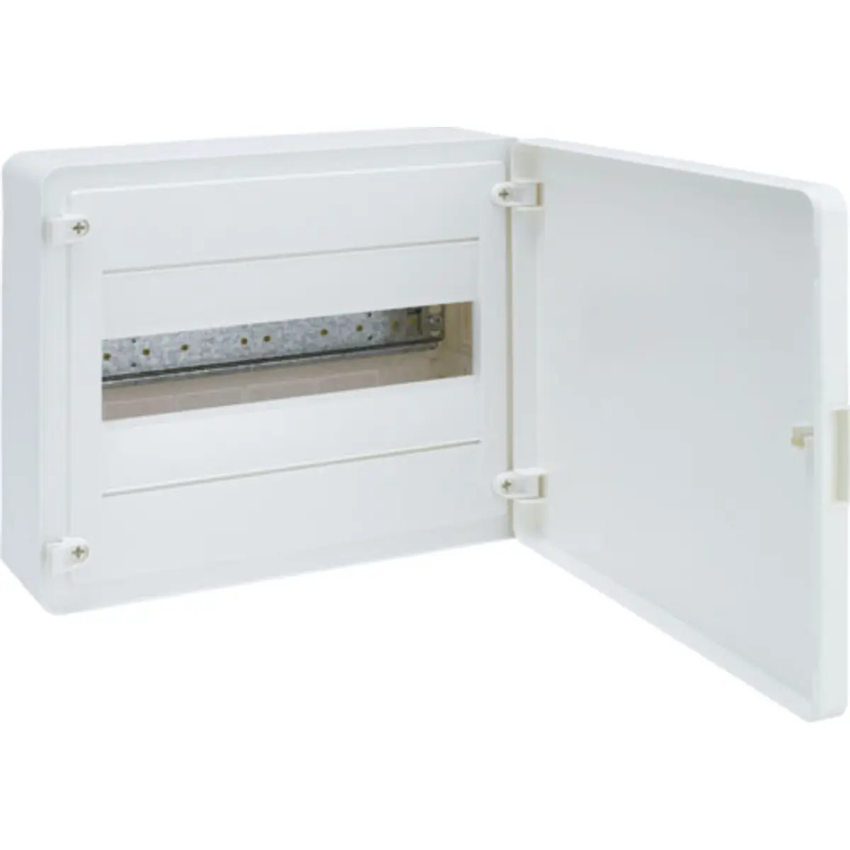 Caixa de distribuição de superfície para quadro elétrico, em material isolante, com capacidade para 12 módulos numa única fila e calha DIN extraível. Permite entrada de cabos superior, inferior e lateral, com porta reversível a 180° e porta opaca com abertura de 180°. Classe II de isolamento, IP40 e IK07 (com porta), cor branca RAL 9010. Fornecida com barramentos de neutro e terra, máscaras, calhas DIN fixas ao fundo com espaço para passagem de cabos por trás, tampões para classe II, filme protetor na porta e etiquetas de identificação de circuitos.