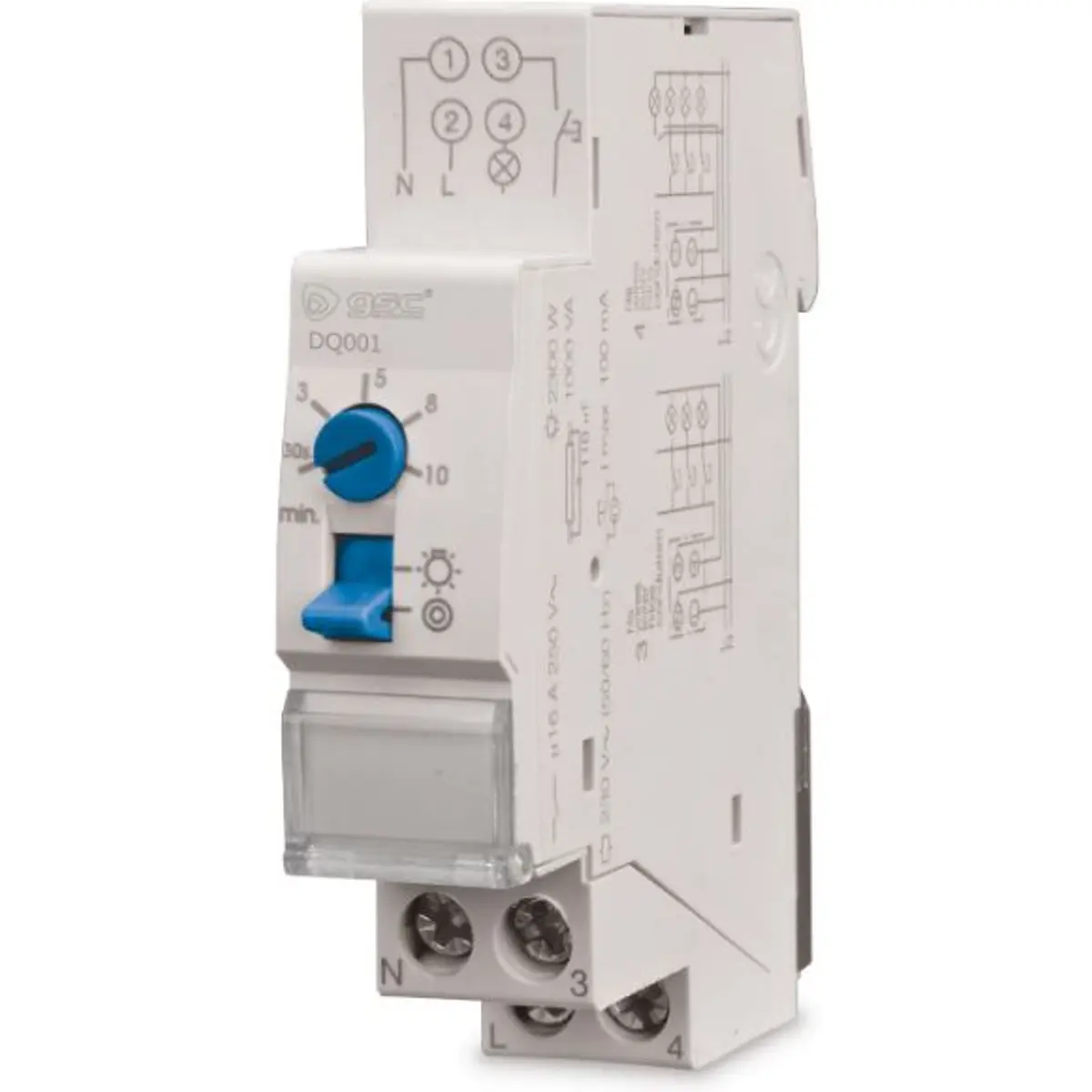 Este temporizador de escada para calha DIN opera em 230VAC, suporta 16A e tem proteção IP20. O atraso é ajustável entre 30 segundos e 10 minutos, oferecendo controlo preciso da iluminação de escadas e de outros circuitos. Ideal para iluminação LED e aplicações interiores, facilita a montagem em perfil DIN, promovendo fiabilidade, segurança e redução de consumos energéticos através de temporização automática.