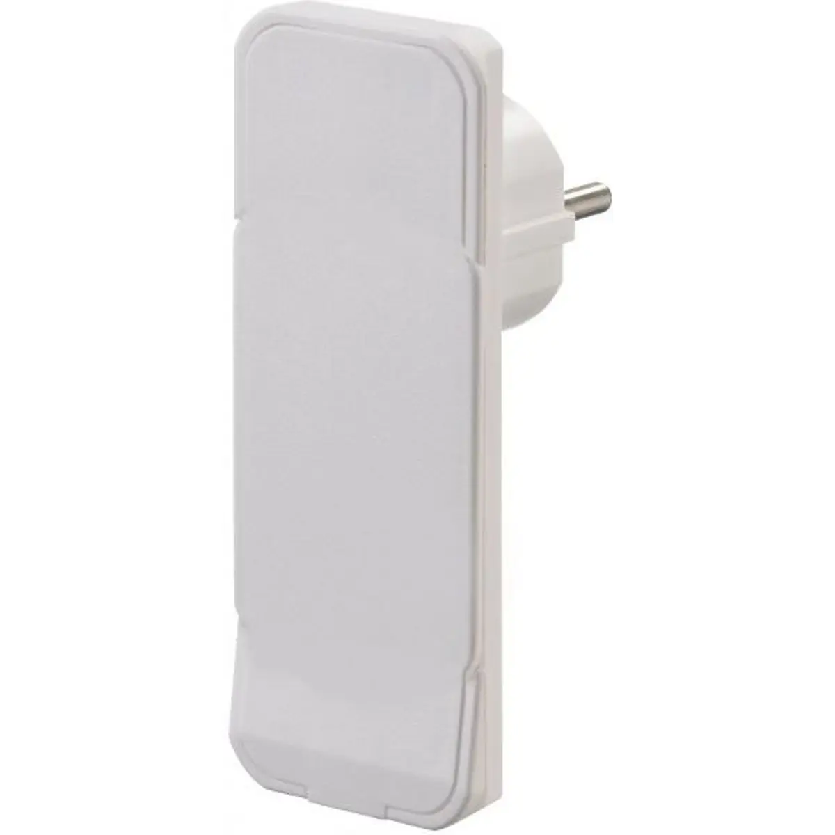 Ficha Schuko extra-plana, acabamento branco e construção compacta, adapta-se a tomadas Schuko comuns, aprovação VDE, sem alavanca nem sistema de ejeção, dimensões de 114x44,5 mm com espessura de 12,5 mm; ideal para espaços reduzidos em cozinhas, escritórios e mobiliário embutido, oferecendo instalação simples, segurança e compatibilidade com tomadas Schuko padrão.