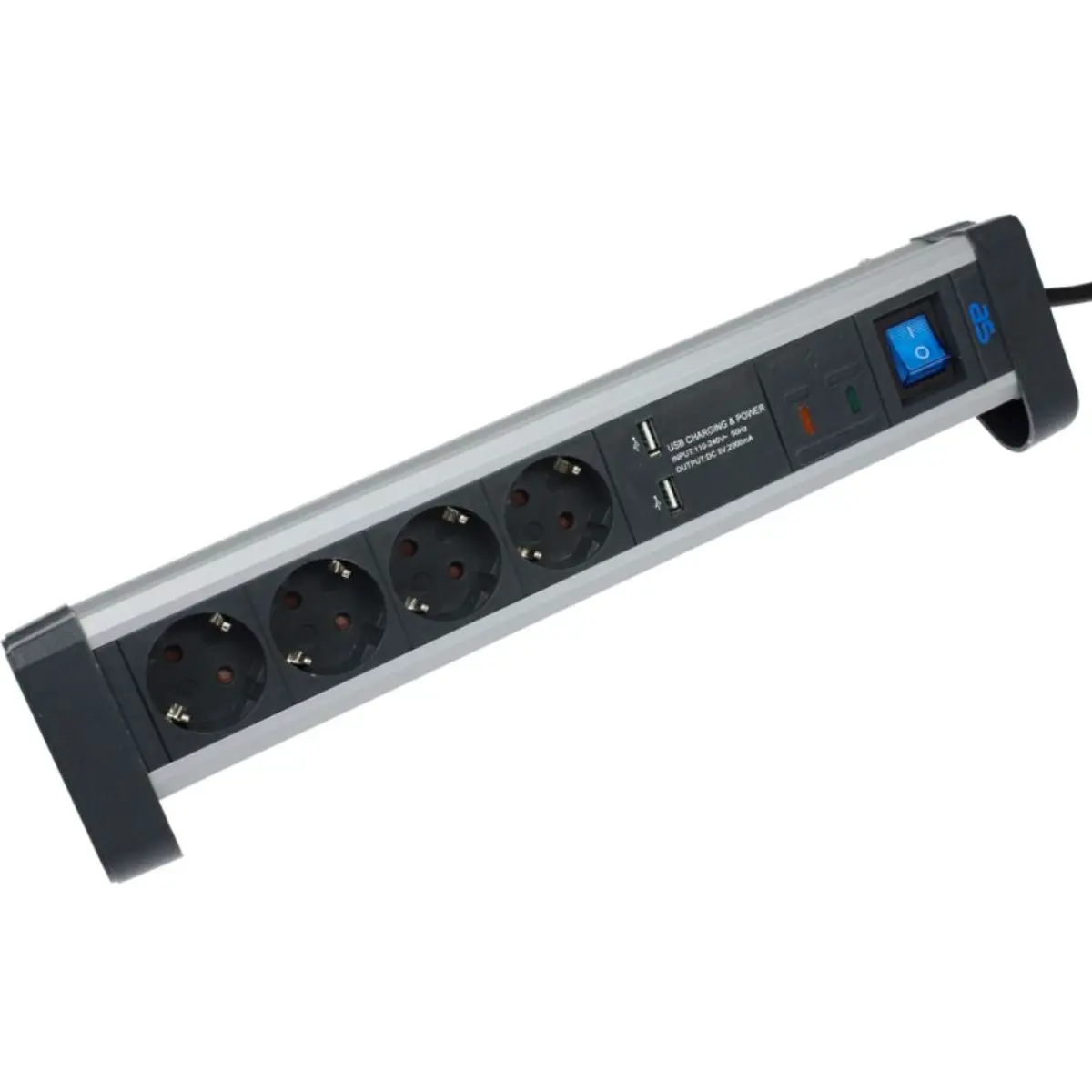 Tomada múltipla com interruptor, portas USB, Proteção contra sobretensões e grampos de fixação para montagem segura em mesas e placas de trabalho.