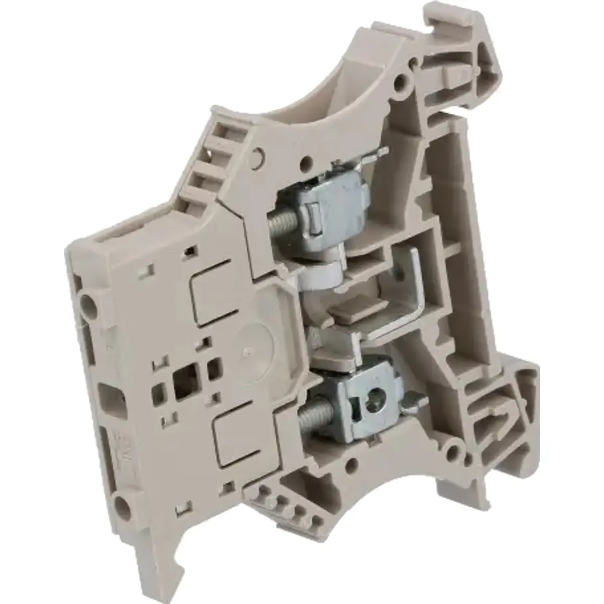 O borne de ligação para fusível para montagem em calha DIN (TS35) oferece ligação segura com seção de cabo 6mm2, tensão nominal de 500V e corrente nominal de 6.3A. Possui montagem por parafuso, versão 1x fusível, cor bege e é adequado para instalações elétricas industriais, assegurando fiabilidade e facilidade de integração.