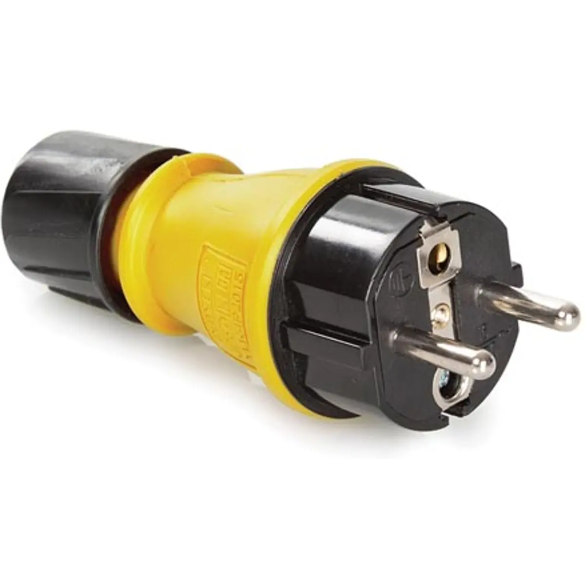 Ficha Schuko macho para uso exterior, com tensão nominal de 250 V e corrente de 16 A, IP54 e corpo em policarbonato com TPR. Oferece resistência às intempéries, durabilidade e segurança em ambientes exteriores. Indicado para aplicações ao ar livre, com dimensões compactas (4,5 x 4,5 x 11,5 cm) e peso de 97 g. Cor preto-amarelo facilita a visibilidade. Projetada para condições climáticas adversas, fornecendo proteção contra água e pó.