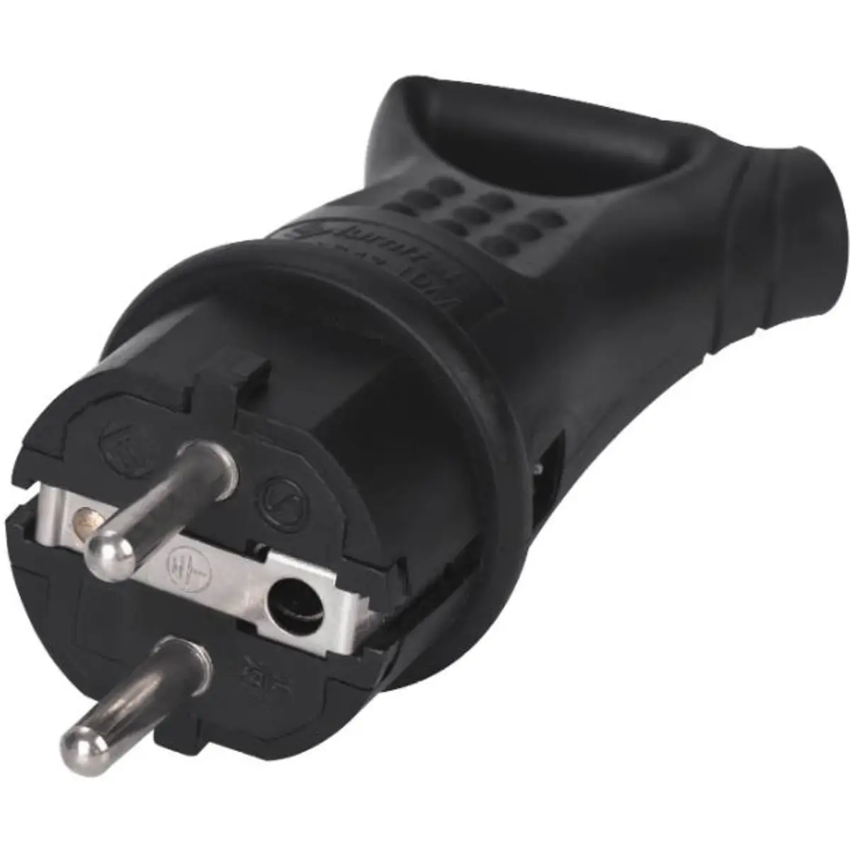 Ficha eléctrica macho com tensão de 250V e corrente de 16A, fabricada em borracha e PVC para maior durabilidade. Os pinos de Ø4.8mm asseguram uma ligação estável, enquanto o puxador facilita o manuseamento seguro. Ideal para aplicações eléctricas que exigem proteção da borracha e resistência a ambientes húmidos, oferecendo montagem simples e operação prática em obras, oficinas ou equipamentos industriais.