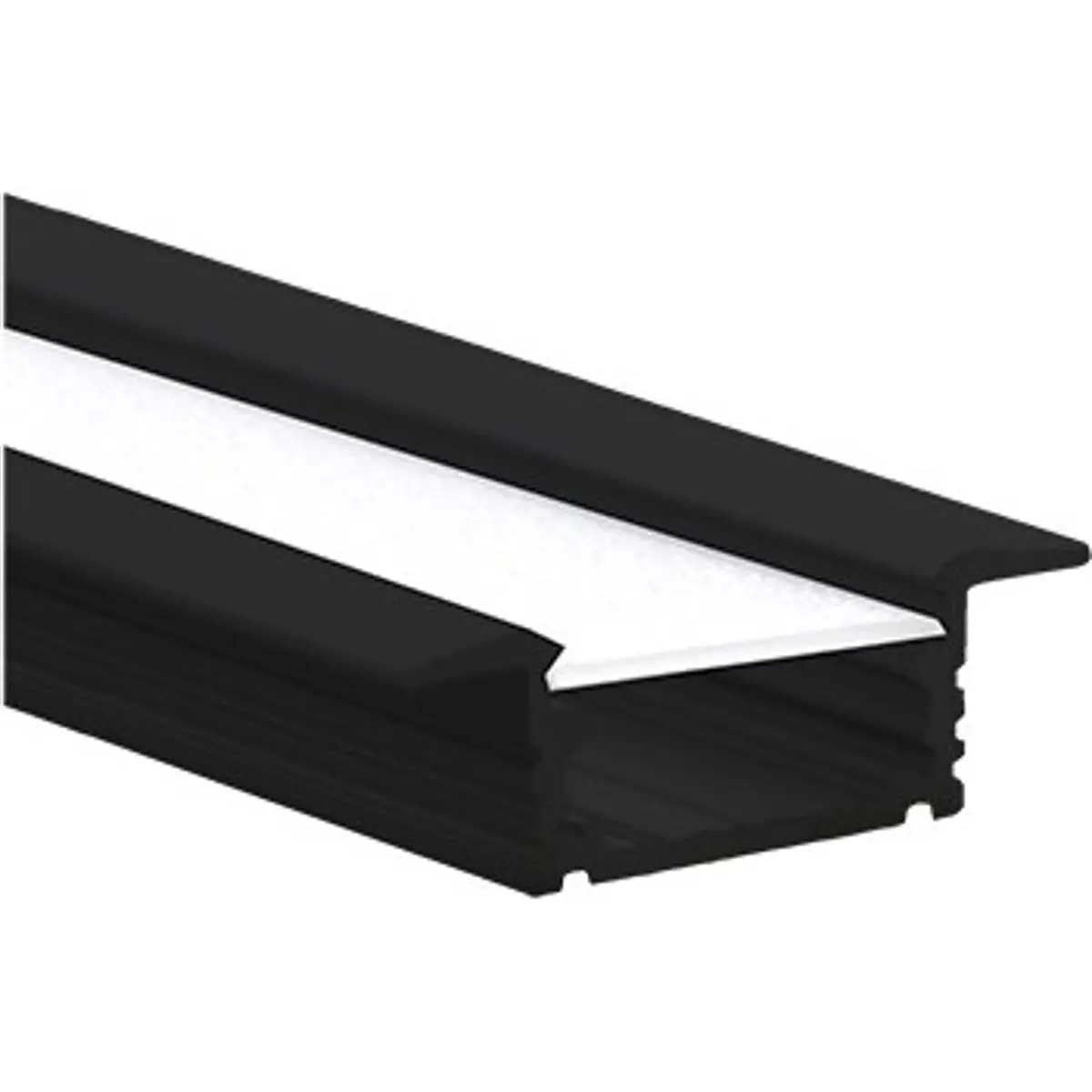 Perfil de alumínio de encastrar para fita de LEDs com dimensões 8.6x27 mm, cor preta e comprimento de 2 metros. Peso: 235 g. Difusor não incluído. Ideal para montagem discreta em canais para iluminação de fitas LED, oferecendo acabamento moderno, boa dissipação de calor e suporte estrutural estável. Compatível com fitas LED padrão e aplicações em mobiliário, lojas, vitrines e iluminação integrada.
