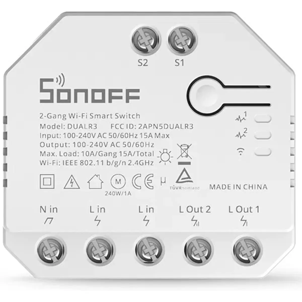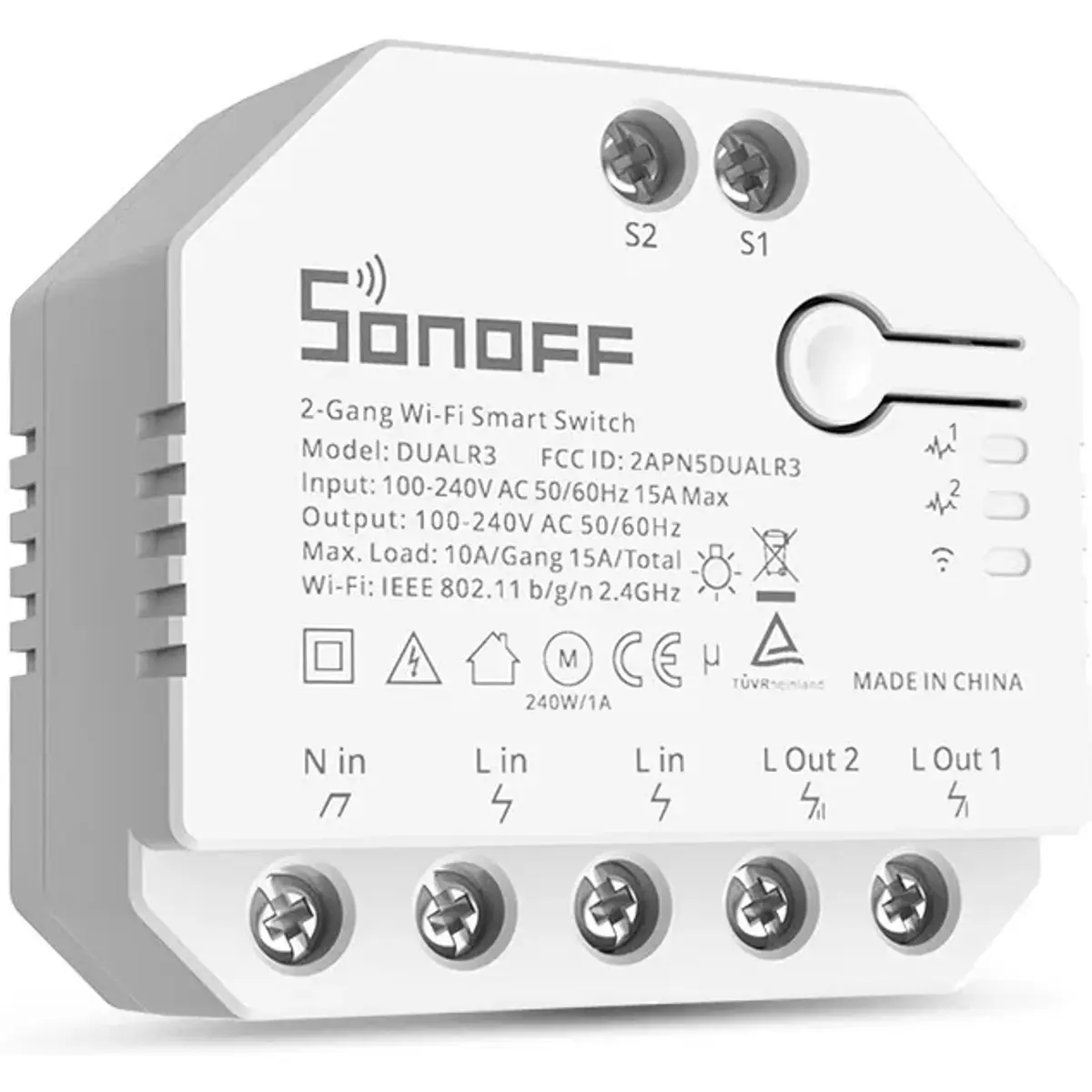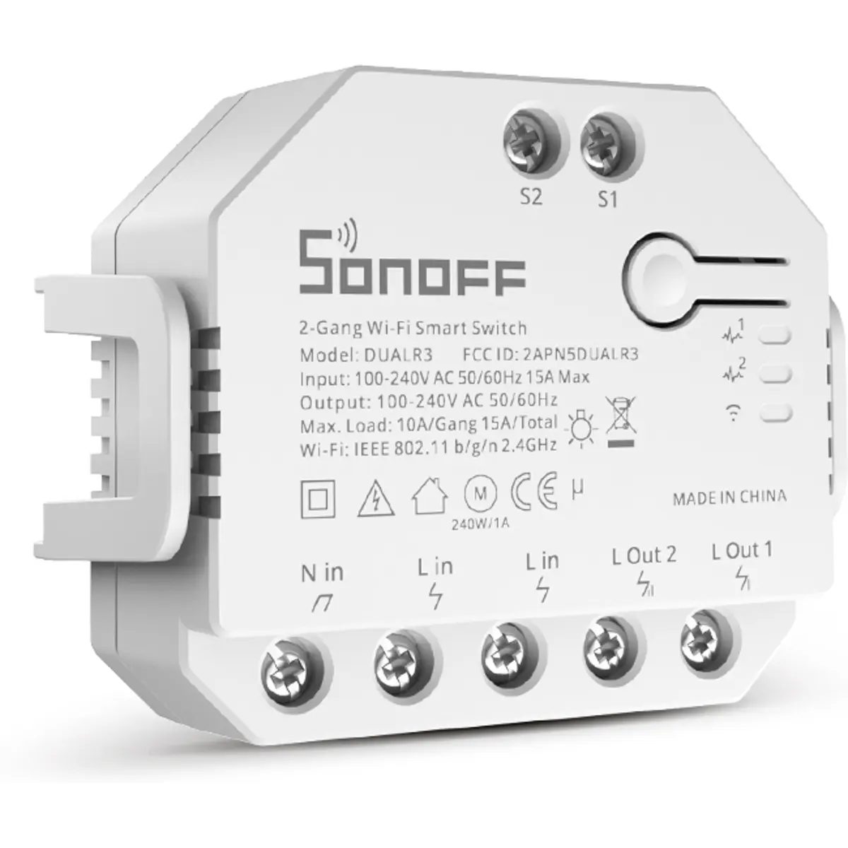 O DUAL R3 é um módulo de interruptor duplo inteligente com relés controláveis por Wi-Fi, através de dispositivos móveis como smartphones ou tablets, mas também podem ser controlados com comandos de voz através da Siri ou outros assistentes virtuais como a Alexa ou Google Assistant.
