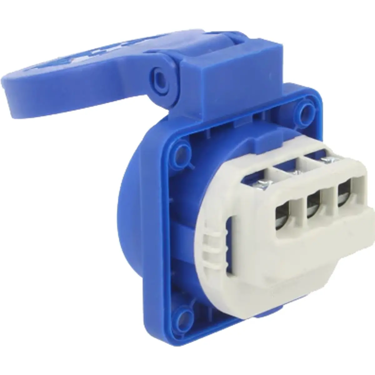 Conector Schuko fêmea de alimentação para caixas modulares FLEX e M-BOX, com montagem elétrica por terminal parafusado e montagem mecânica roscada. Suporta 16A a 250V AC, com dimensões de 50x50 mm e acabamento azul. Compatível com molduras 50x50 (ref. 302-2888) para instalação em sistemas modulares, incluindo proteção IP54. Ideal para aplicações de alimentação em instalações elétricas internas, oferecendo conectividade fiável, segurança eléctrica e montagem prática em caixas modulares.