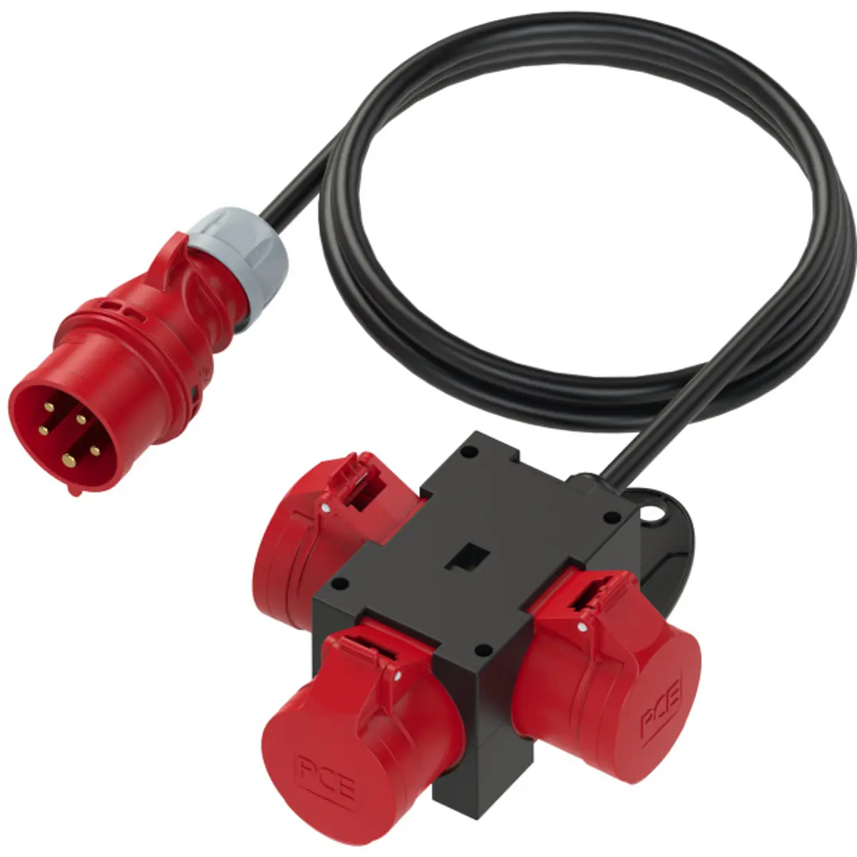 Bloco de tomadas com extensão trifásica CEE, 3P+N+T, 16 A, 400 VAC, IP44, com cabo de 1,5 m. Inclui uma ficha macho de 5 pinos e três tomadas fêmeas de 5 pinos, possibilitando ligações seguras de cargas trifásicas em instalações interiores ou exteriores. Compatível com redes de 400 VAC, este equipamento oferece proteção IP44 para ambientes húmidos ou poeirentos, e está disponível em preto/vermelho. Ideal para painéis elétricos, eventos, obras e aplicações industriais que exigem organização e fiabilidade.