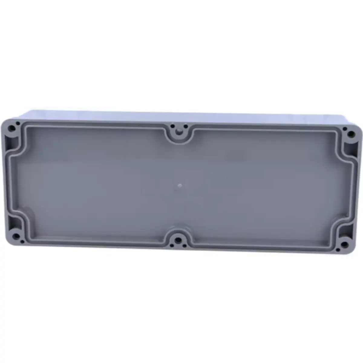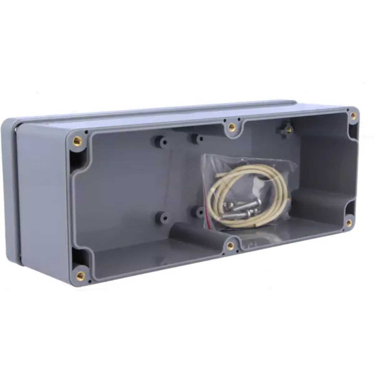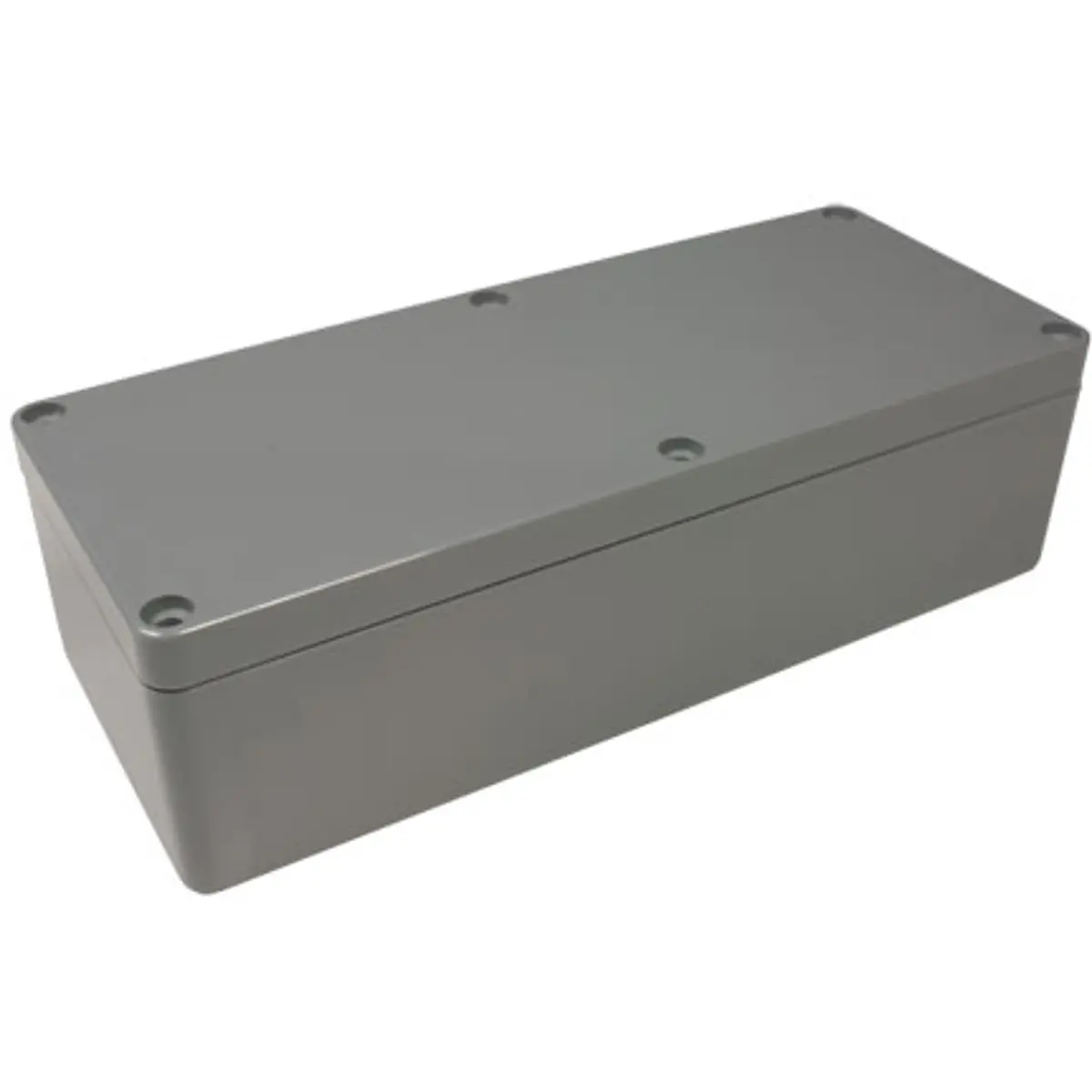 Caixa estanque de alto impacto em ABS, com tampa e base vedadas por junta de neopreno. O design inclui orifícios de montagem fora da área vedada para evitar humidade e pó, e ranhuras de guia internas que permitem a montagem vertical de conjuntos de PCB. Ressaltos na base interna facilitam a fixação horizontal de PCB ou de terminais. Funciona entre -20°C e +100°C, sendo adequada para ambientes exigentes.