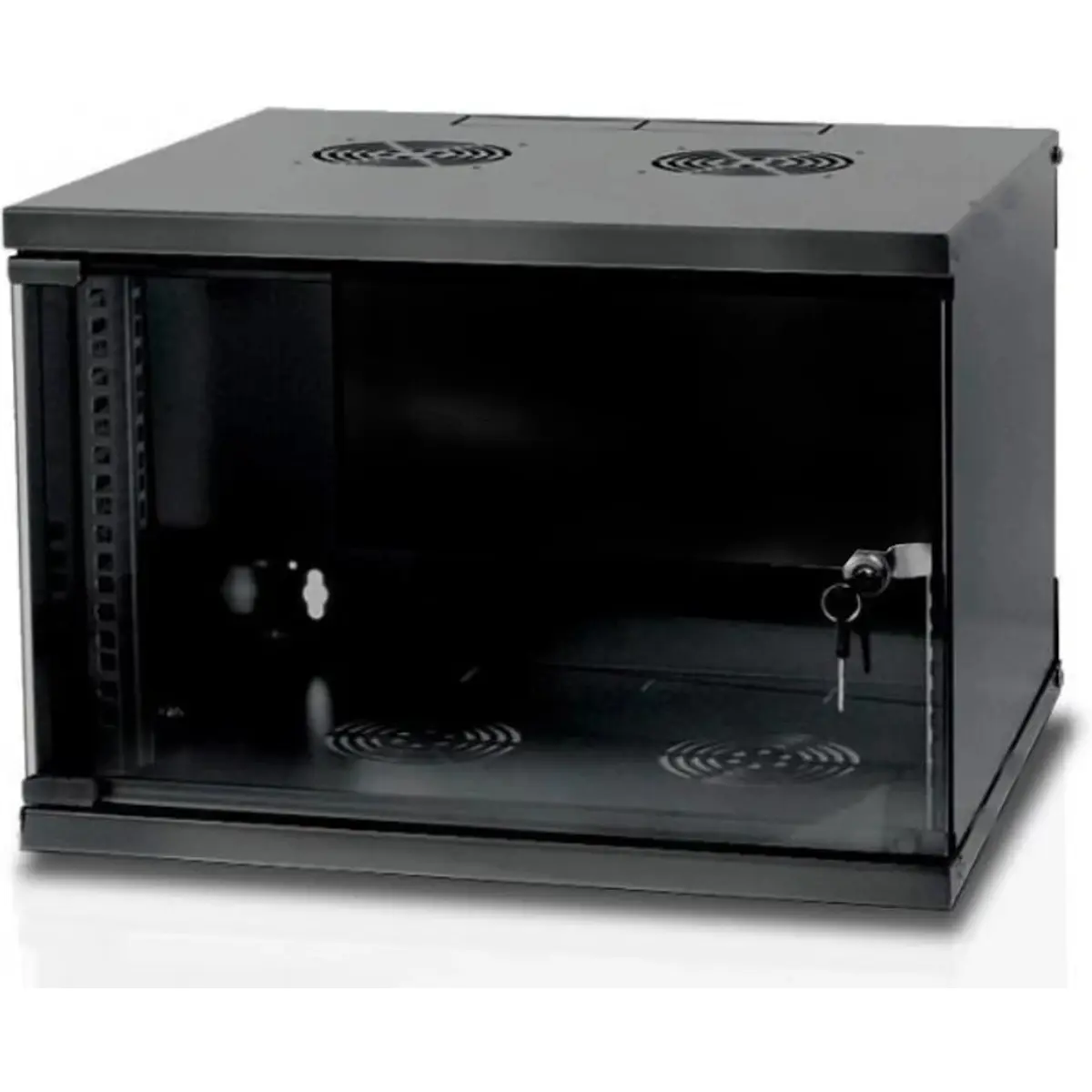 Armário bastidor de parede de 19 polegadas com altura útil de 9U, largura externa de 600 mm, profundidade de 400 mm e altura externa de 500 mm, proporcionando espaço padronizado para equipamentos de rede. Possui porta de vidro temperado de 5 mm com abertura de 180°, dois painéis laterais e duas entradas para cabos (superior e inferior). Classificado com IP20, ideal para instalação de hardware de telecomunicações em salas técnicas, garantindo organização, acesso rápido aos componentes e segurança física.