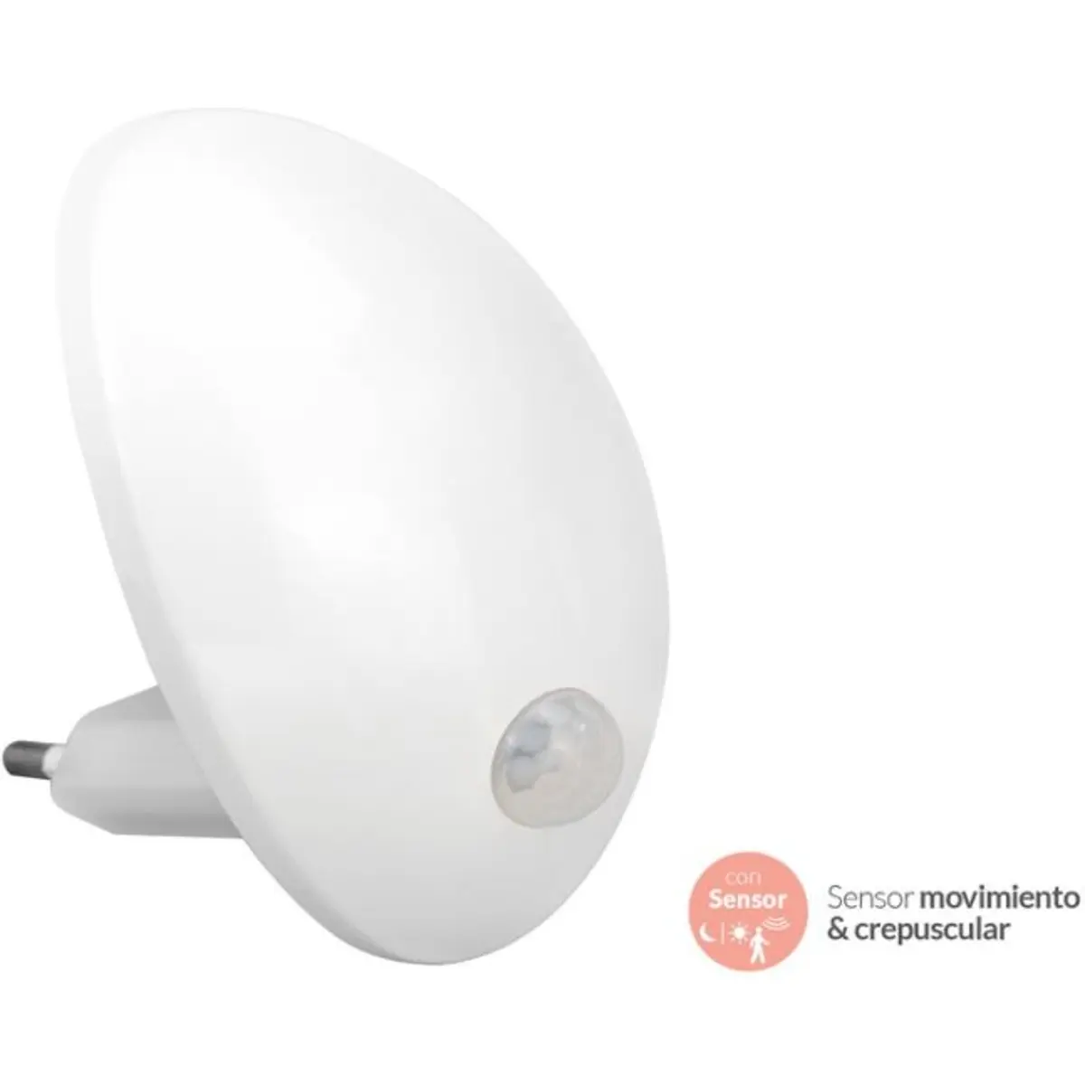 Luz de presença com sensor de movimento e crepuscular para 230VAC, de baixo consumo (0,65 W) e 10 lm, com temperatura de cor de 3000 K. O sensor deteta até 3,5 m com ângulo de 110°, acendendo quando a luminosidade é inferior a 20 lux e permanecendo ligada cerca de 30 segundos. Fabricada em PC, com dimensões de 90 x 55 x 53,5 mm, é indicada para passagem interna, escadas e corredores, alimentando-se diretamente da tomada.