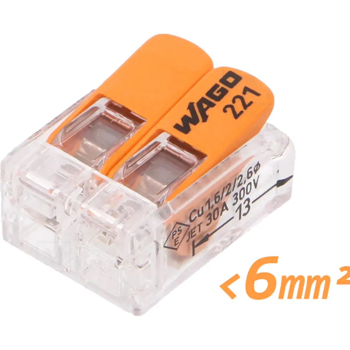 Conector rápido da série 221, destinado a ligações elétricas com patilhas para fios unifilares e multifilares. Montagem elétrica por aperto de molas, permitindo uma fixação rápida e segura. Tensão nominal de 450V e corrente nominal de 41A, com montagem mecânica com cabo e faixa de cabo de 0,5 a 6 mm² (20 a 10 AWG). Versão com alavanca e duas braçadeiras, num único canal com uma faixa. Ideal para instalações elétricas compactas que exigem fiabilidade, eficiência de montagem e compatibilidade com cablagem variada.