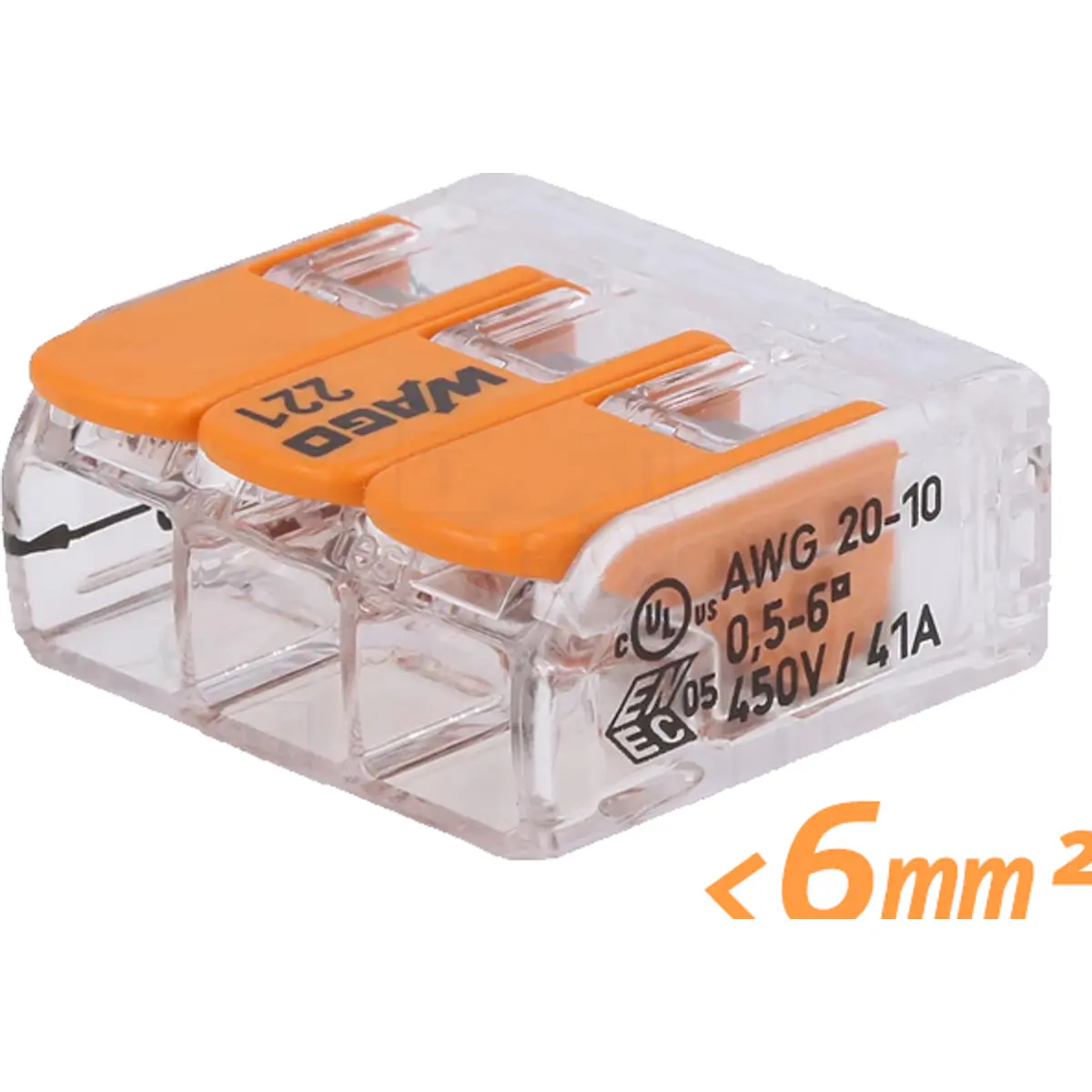 Ligador rápido para ligações elétricas, adequado para fios unifilares e multifilares com seção de 0,5 a 6 mm² (20 a 10 AWG). Permite montagem com cabo, com aperto por mola e versão com alavanca, suportando até 450 V e 41 A. Possui uma única faixa de condução e três braçadeiras para fixação estável, ideal para ligações rápidas em painéis elétricos, blocos de terminais e quadros de distribuição, acelerando instalações e assegurando fiabilidade e segurança.