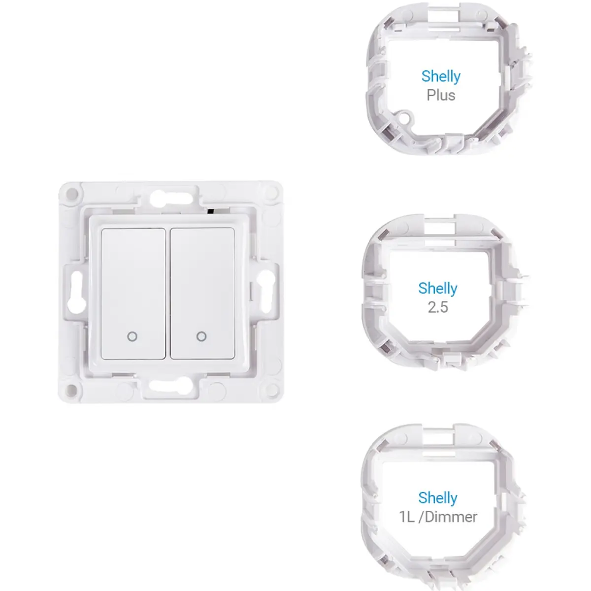 Este interruptor de 2 botões vem com 3 suportes encaixáveis para diferentes módulos Shelly: