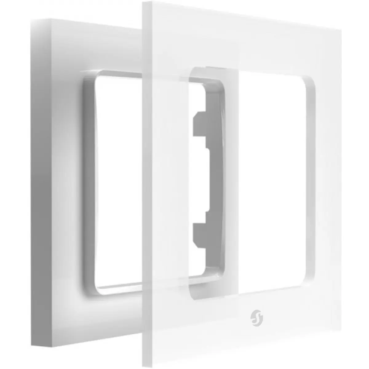 Espelho branco para um interruptor de parede Shelly. Constituído por duas partes: uma moldura para o interruptor e o espelho propriamente dito, para um elegante toque final.