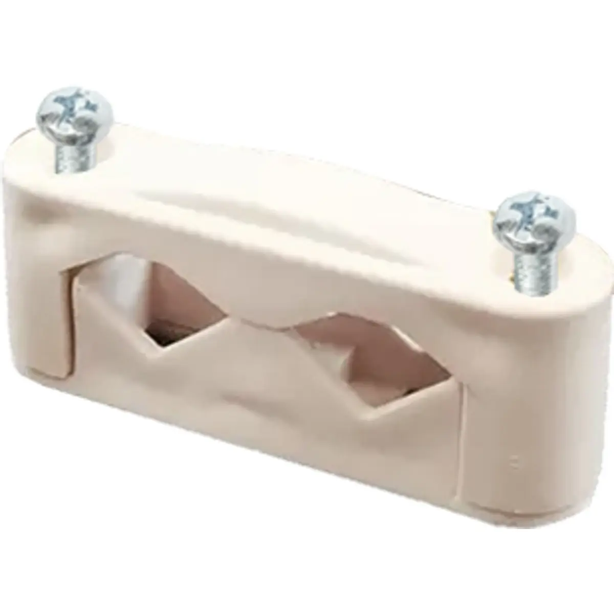 Abraçadeira de aperto mecânico dupla para cabo rígido Ø10..18mm com parafuso metálico, acabamento creme; oferece fixação segura, estável e durável para cabos em montagens elétricas e mecânicas, sem folgas, em ambientes industriais.
